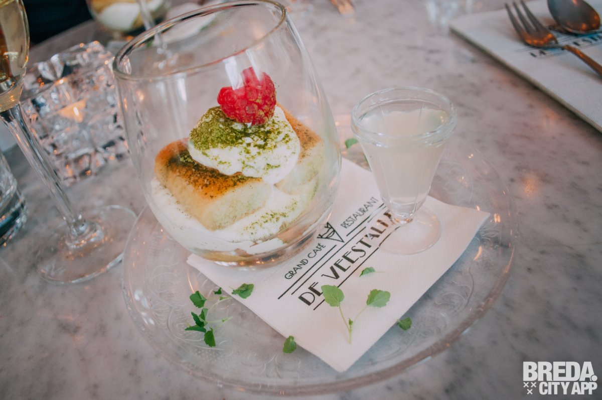 We sluiten onze avond af met een bloemige en zoete Spaanse Moscatel wijn van Dona Dolca met een zachte afdronk. Bij dit laatste drankje krijgen we een frisse limoncello tiramisu met mascarpone, matcha poeder, limoenzeste en een extra glaasje limoncello. De limoncello is huisgemaakt en wordt los geserveerd in een glaasje. Zo kan je zelf beslissen of je de limoncello nipt of mengt met de tiramisu. Dit dessert is een perfecte frisse en zomerse afsluiter van een heerlijk avondje uit.
