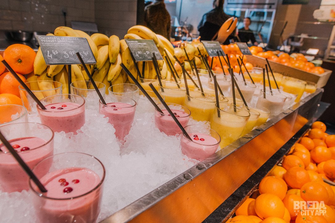 In de tussentijd kiezen we een verse smoothie uit om straks bij de pizza te drinken. Ons oog valt op de 'Winterse Cranberry Yoghurt' smoothie. De cranberry’s van La Place worden hand geplukt op Vlieland. Ze groeien in het wild en worden niet geteeld, bemest of bewaterd. Het is een groot glas, maar als je het niet op kunt, kan je altijd een meeneem beker vragen.