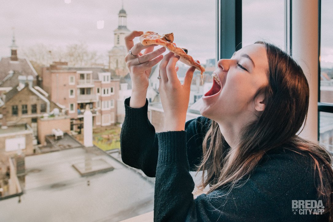 De pizza is klaar en wat ziet die er lekker uit! We kiezen een plekje bovenin, bij het raam met prachtig uitzicht op de binnenstad. Het eerste stuk snijden we aan en je ziet dat de kaas goed gesmolten is. Zoals het hoort bij een goede pizza!