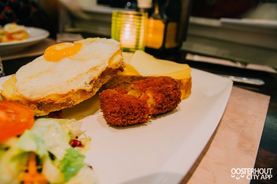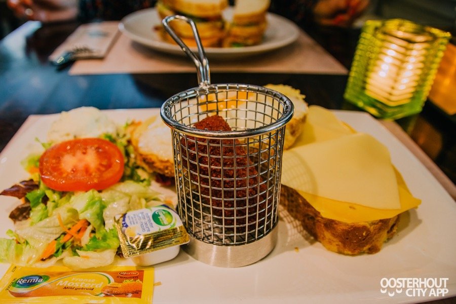 Het andere lunchgerecht is een Woods uurtje kaas. Er is keuze uit drie variaties: Woods uurtje vlees, Woods uurtje vis en Woods uurtje kaas. Als echte kaaskoppen kiezen wij natuurlijk voor de kaasvariant met maïsbrood. Op de ene snede ligt een spiegelei en op de andere snede ligt zowel jong belegen kaas als ‘’Oosterhouts Trots’’. Deze kaas is speciaal voor Oosterhout ontwikkeld en is een 11 maanden natuur gerijpte kaas met een licht zoetige smaak. Lekker om te combineren met het spiegelei. In het snackmandje wordt een kaaskroketje geserveerd. Deze is erg lekker en een klein beetje pittig van smaak. Bij dit lunchgerecht wordt een slamix met tomaat en een smakelijke aardappelsalade geserveerd. Liefhebbers kunnen zelf de sneden maïsbrood aankleden met roomboter of mosterd.