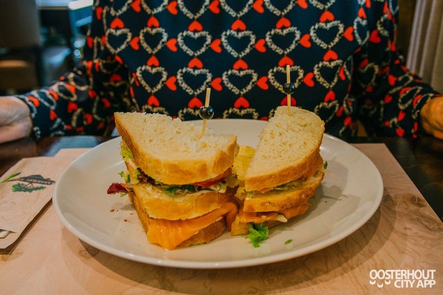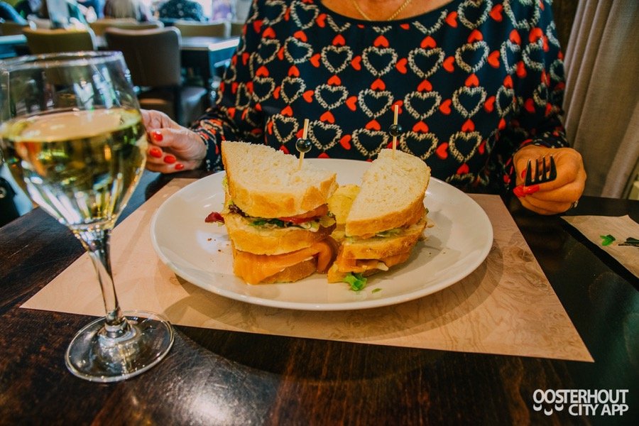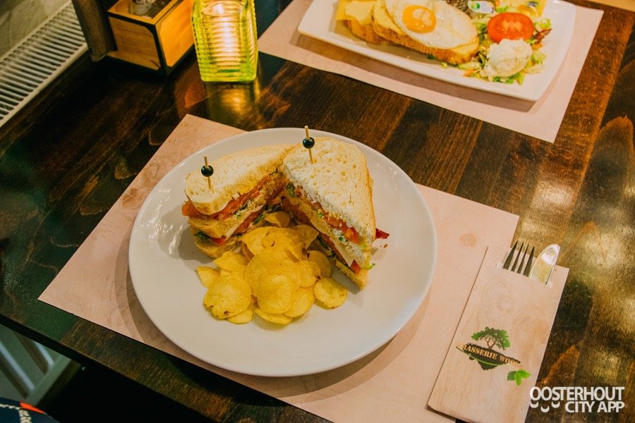 Onze gastvrouw neemt enthousiast onze bestelling op. Wij kiezen voor een Zalm Club Sandwich en een Woods uurtje kaas. Lang hoeven wij niet te wachten op de gerechten en dat komt goed uit, want wij hebben een lekkere trek. De borden zijn mooi opgemaakt en de gerechten zien er heerlijk uit!