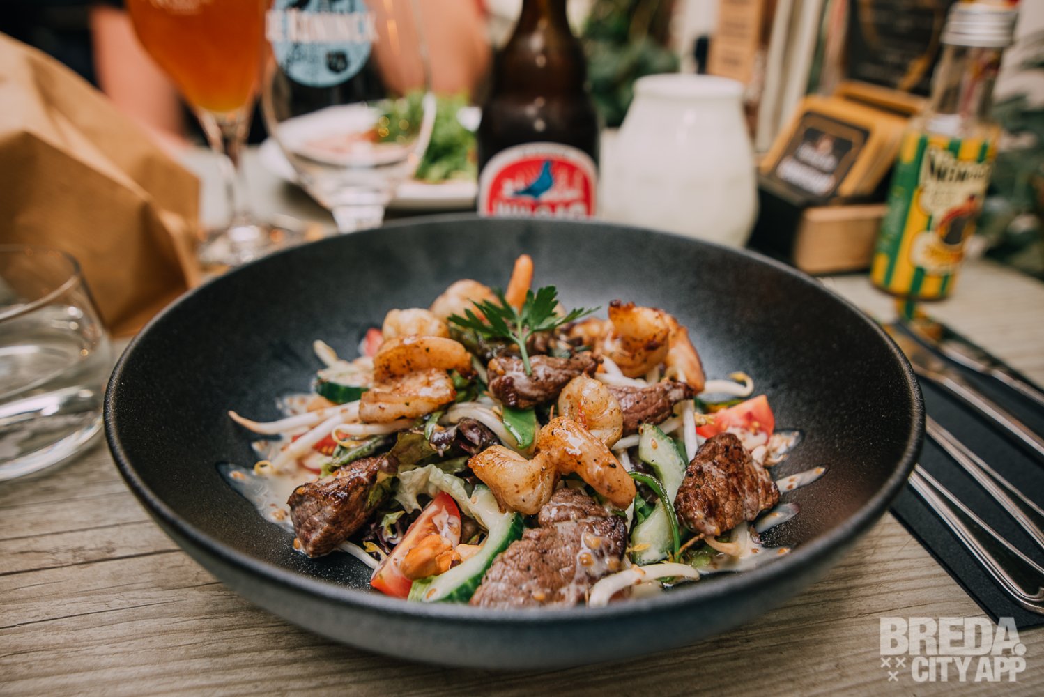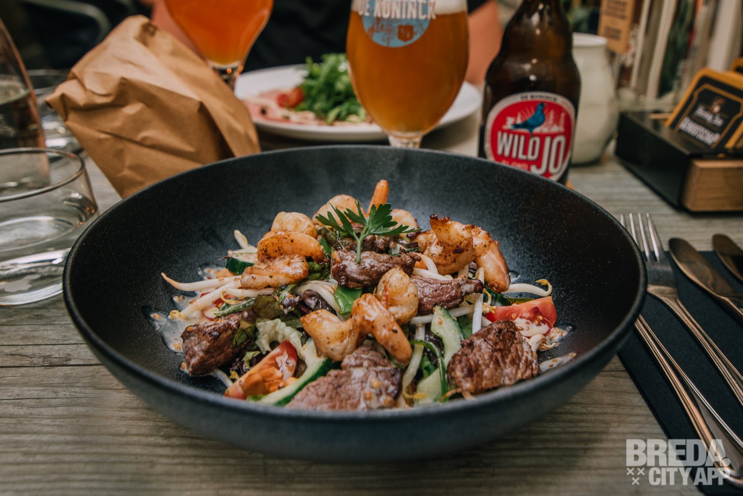 De Japanse surf 'n turf bestaat uit gamba's, biefstuk reepjes, cashewnoten, peultjes en taugé. Een mooie combinatie van een fris gerecht met het knapperige van de peultjes en taugé. De gamba's en de biefstuk puntjes zijn lekker op smaak gebracht, genieten! Bij de surf en turf krijgen we een blond biertje geserveerd: de Wild Jo van Brouwerij de Koninck.