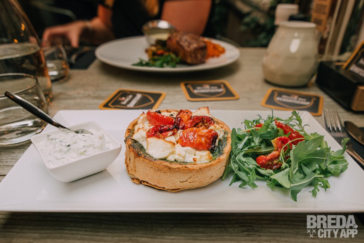 Als tweede hoofdgerecht krijgen we de vegetarische quiche, bestaande uit spinazie, feta, zongedroogde tomaat en courgette, met daarnaast een frisse yoghurt-kruidendressing. De quiche is heerlijk van smaak, echt een lekker vegetarisch gerecht! De verschillende smaken worden perfect gecombineerd in deze quiche. De frisse yoghurt-kruiden dressing is onmisbaar bij dit gerecht, heerlijk!