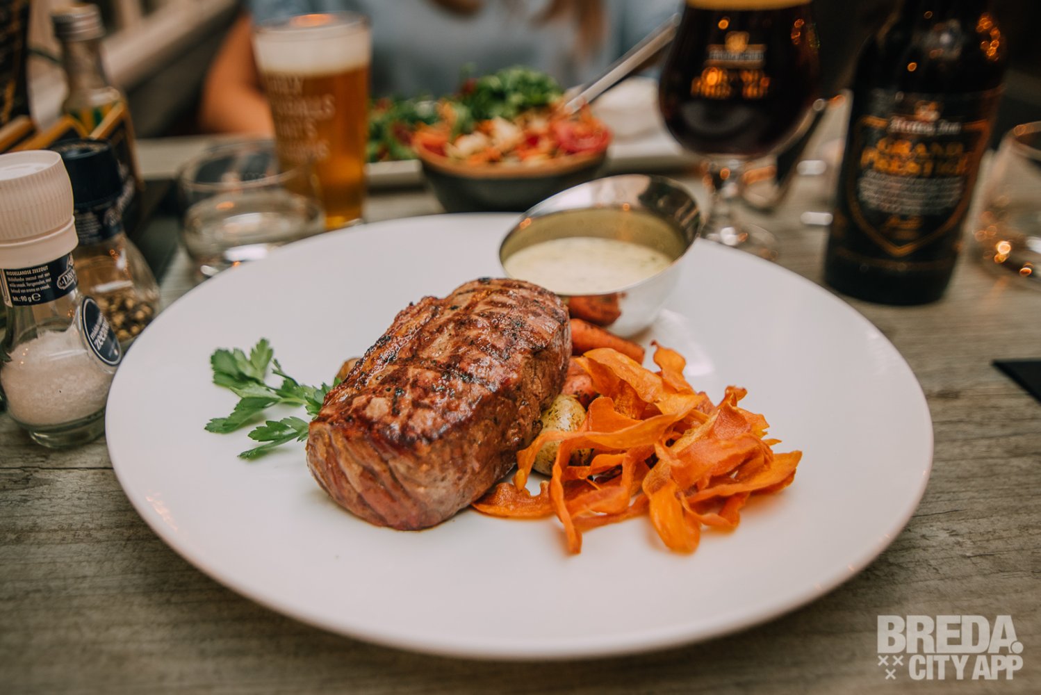 We besluiten om de entrecote als eerst te proeven. Heerlijk mals, mooi rood vanbinnen en dus perfect gegaard! Daarbij krijgen we seizoensgroenten geserveerd en kruidenbotersaus. Als bijpassend biertje krijgen wij de Hertog Jan Grand Prestige geserveerd. In dit bier proef je een mooie combinatie tussen bitter en zoet. De smaken combineren weer uitstekend met het mooie gerecht.