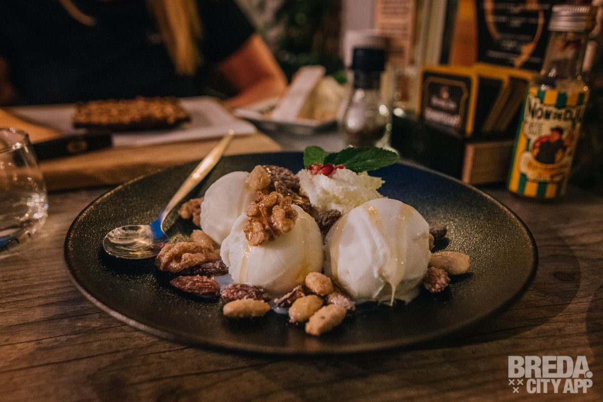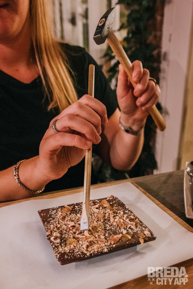 Leuk om te weten is dat je naast het dessert ook chocolade kunt bestellen! Op de kaart staat melkchocolade, chocolade van het seizoen en pure chocolade. Wij laten ons verrassen en kiezen voor de chocolade van het seizoen. Niet veel later wordt ons een enorm stuk melkchocolade met walnoten van banketbakker H. van Haaren naar onze tafel gebracht. We krijgen hierbij een hamer en beitel en beginnen te hakken, hoe orgineel! Publieke Werken is de enige in Breda die de chocolade zo serveert!