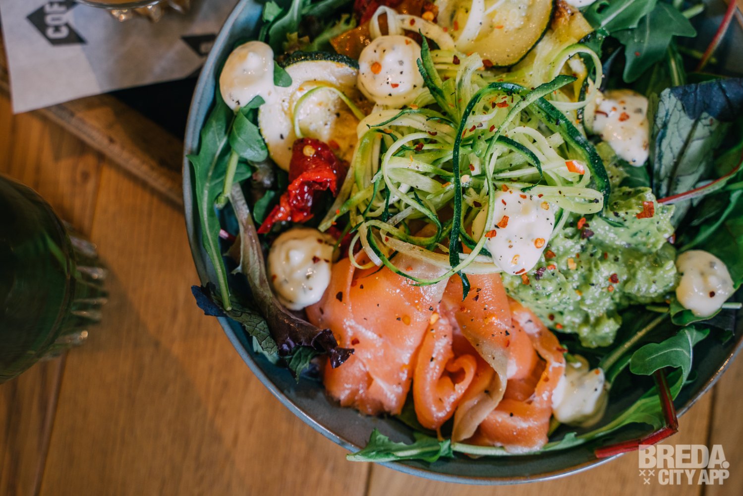 Daarna volgt de zalm-avocado salade. Een heerlijke portie voor een tweede gang, waarbij de avocadospread en mierikswortel mayo samen voor een zachte smaak en licht-zoete dressing zorgen. De bite van de zongedroogde tomaatjes en gegrilde groenten is een mooie balans met de smoothie dressing. Ook leuk: wil je je salade upgraden? Kies dan uit 10+ toppings en creëer je eigen combinaties.