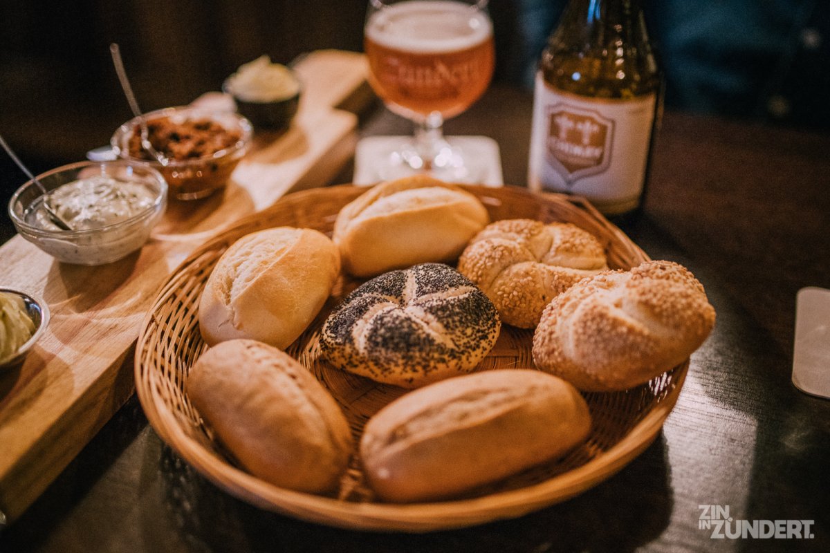 We eten hierbij vers gebakken broodjes en vier verschillende smeersels: boter, kruidenboter, een rode tappende en frisse kruidencrème.