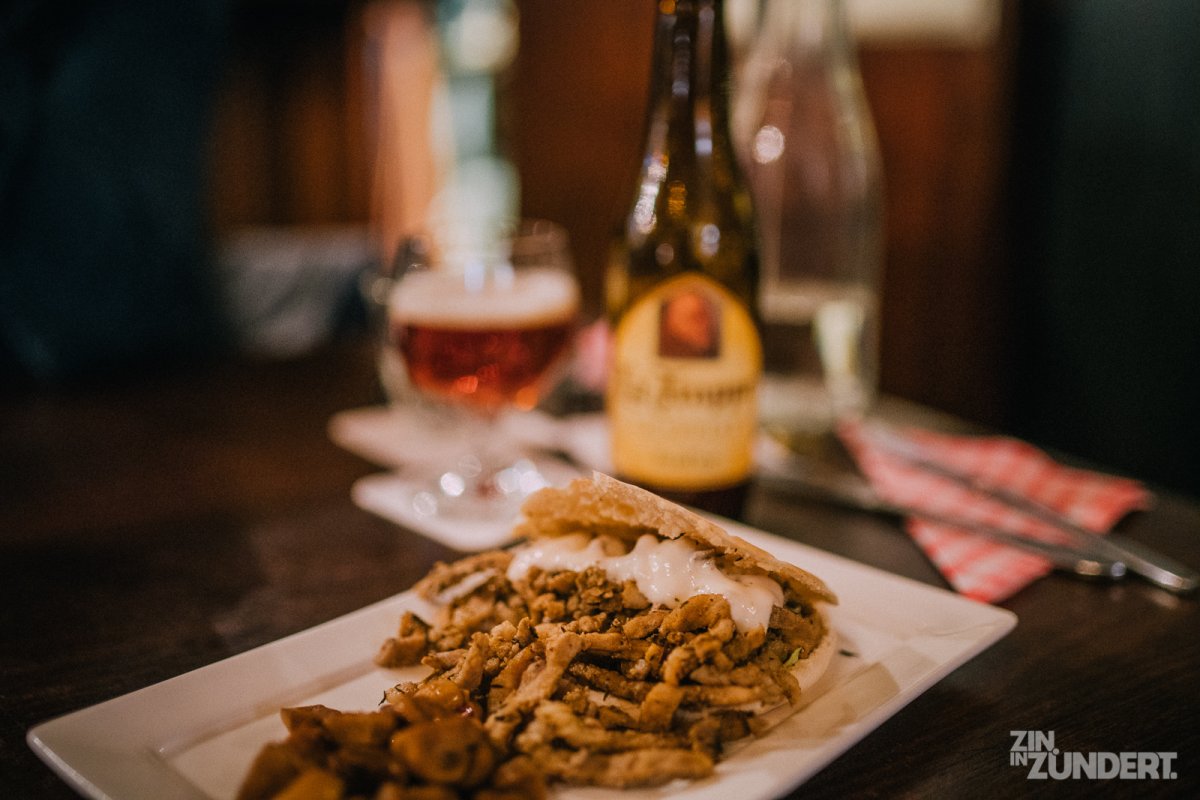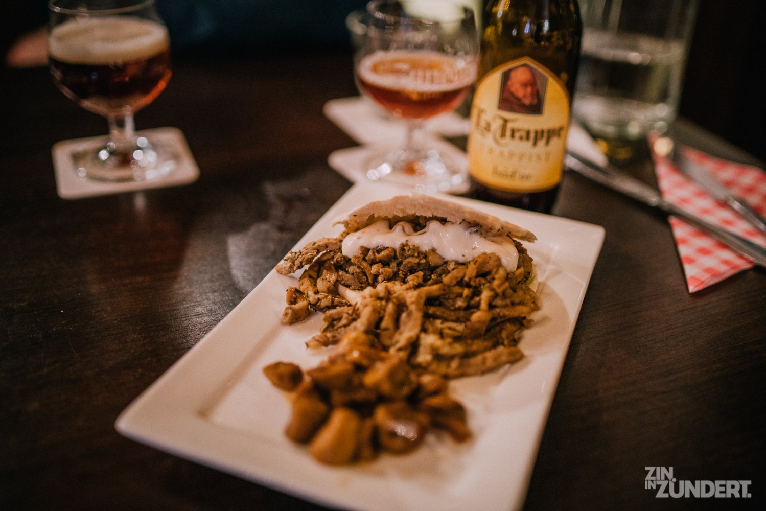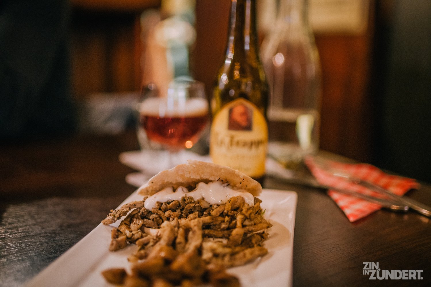 Bij dit bier aten we een kruidig broodje shoarma met gebakken champignons.
