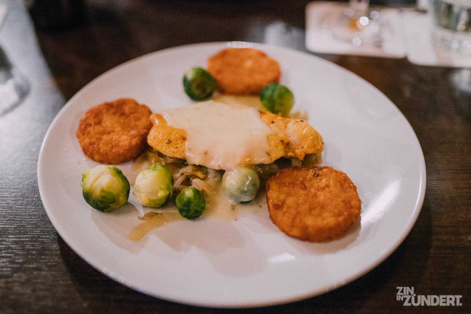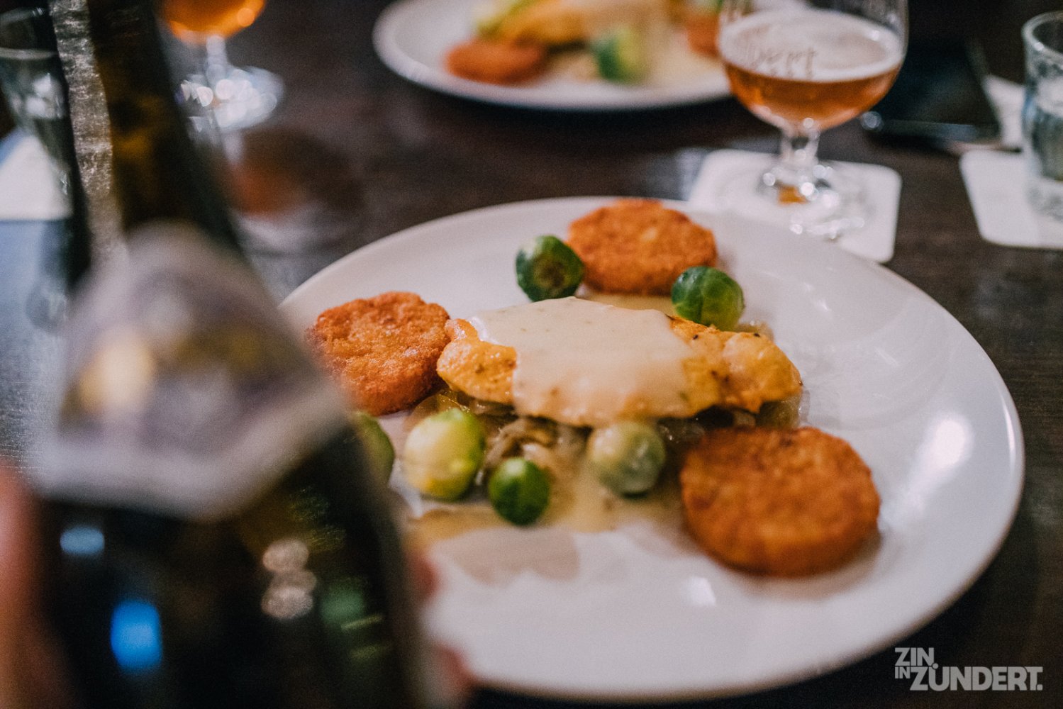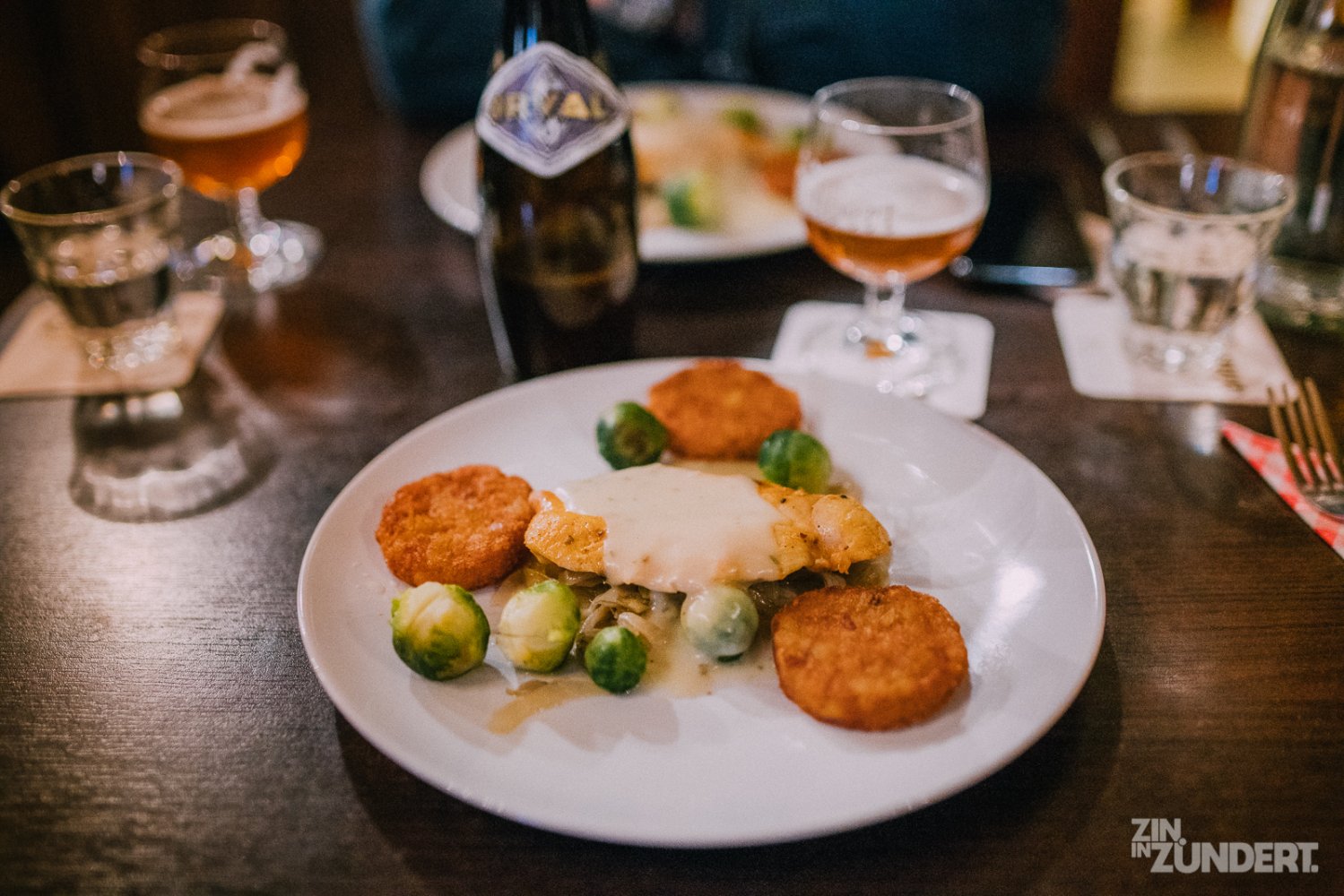 Bij dit bier wordt het hoofdgerecht geserveerd: een gegrilde kipfilet op een bedje van witlof en een roomsaus, vergezeld door spruitjes en aardappel rösti's.