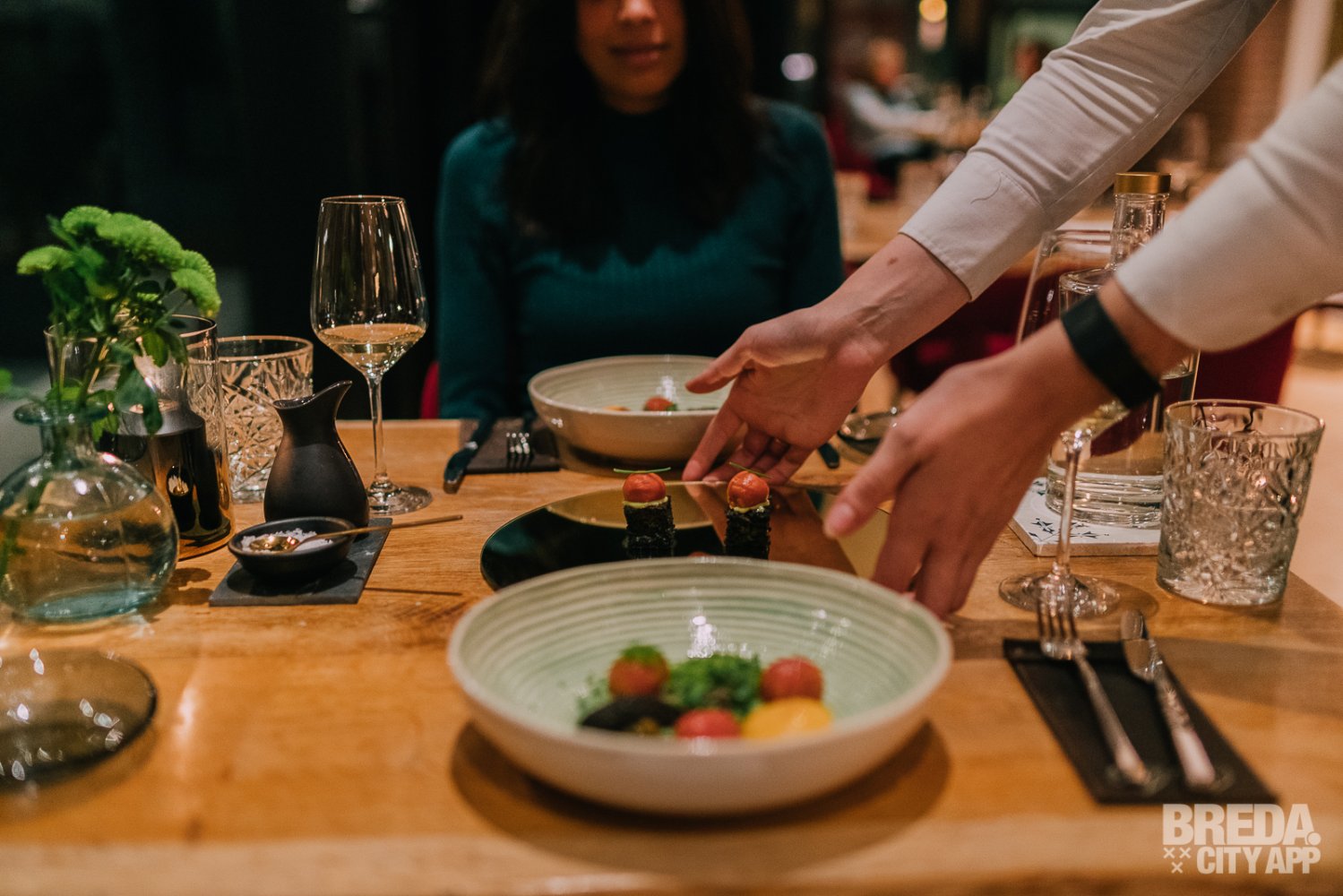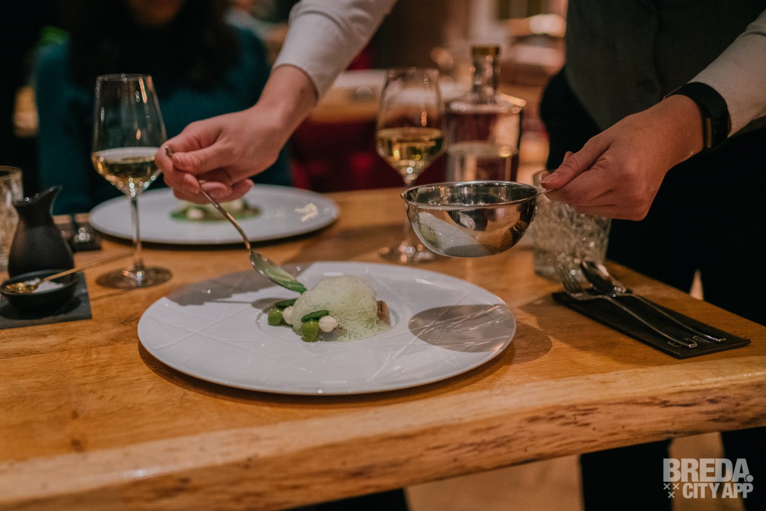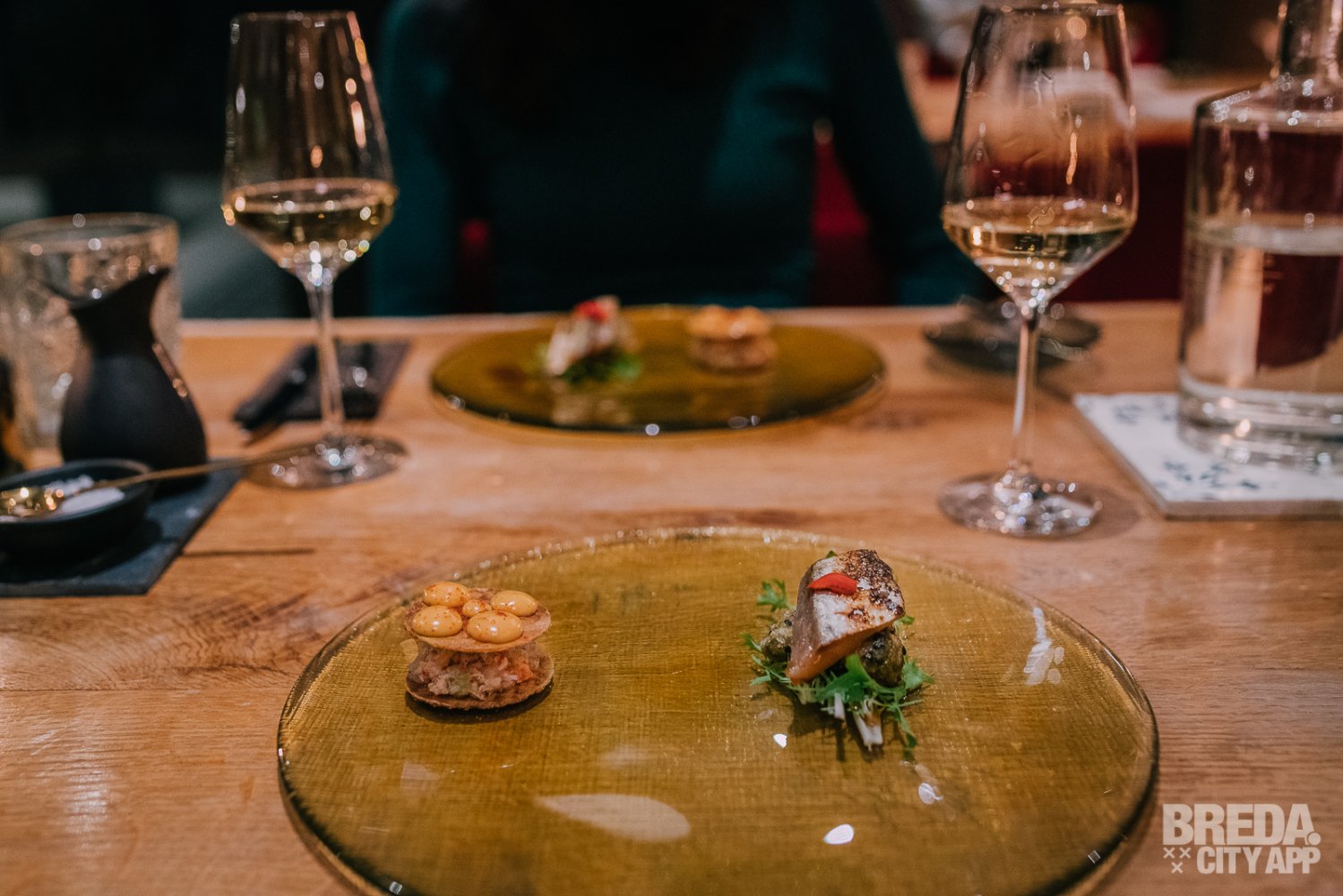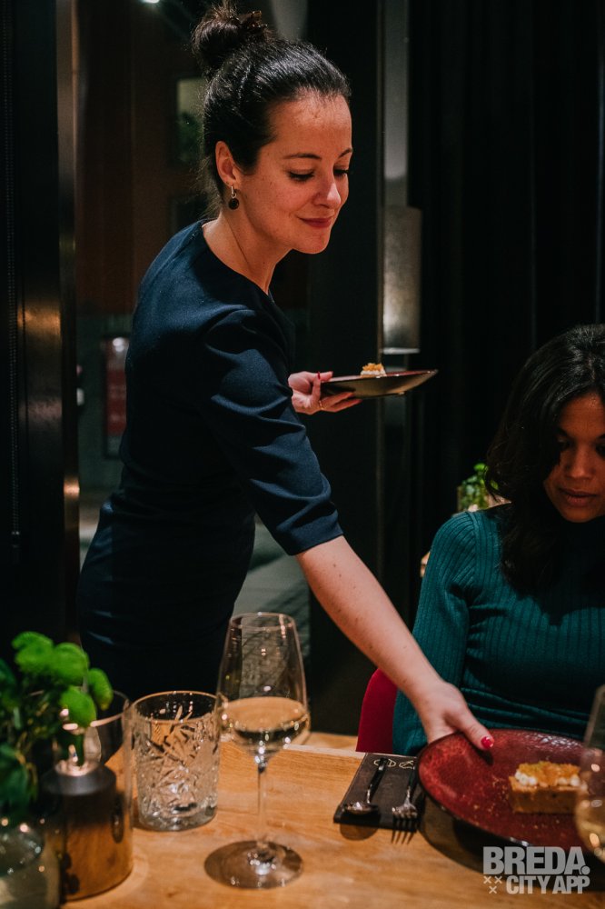 Liefdegesticht is het restaurant van Hotel Nassau Breda en de plek om je culinaire lusten te bevredigen. Bij binnenkomst worden we vriendelijk ontvangen door onze gastvrouw Nina. We nemen plaats aan een gezellige tafel met uitzicht op het water. De culinaire reis starten we met zuurdesembrood geserveerd met gerookte boter en grof zeezout. Het brood is nog warm en heerlijk in combinatie met de luchtige boter. De rooksmaak is subtiel aanwezig maar overheerst niet.