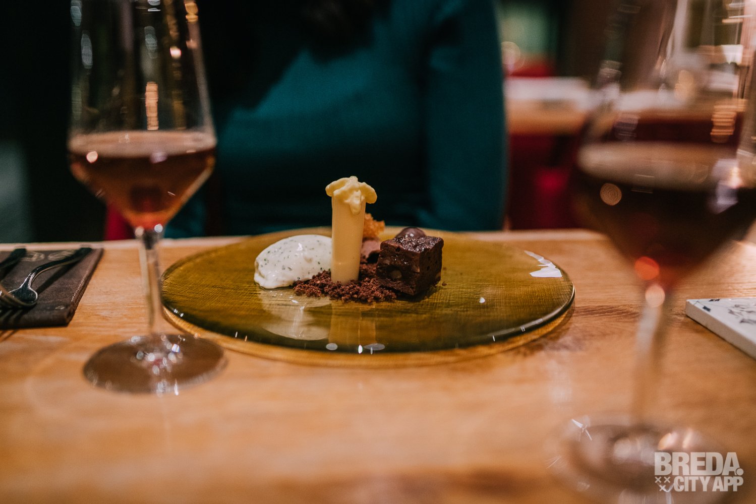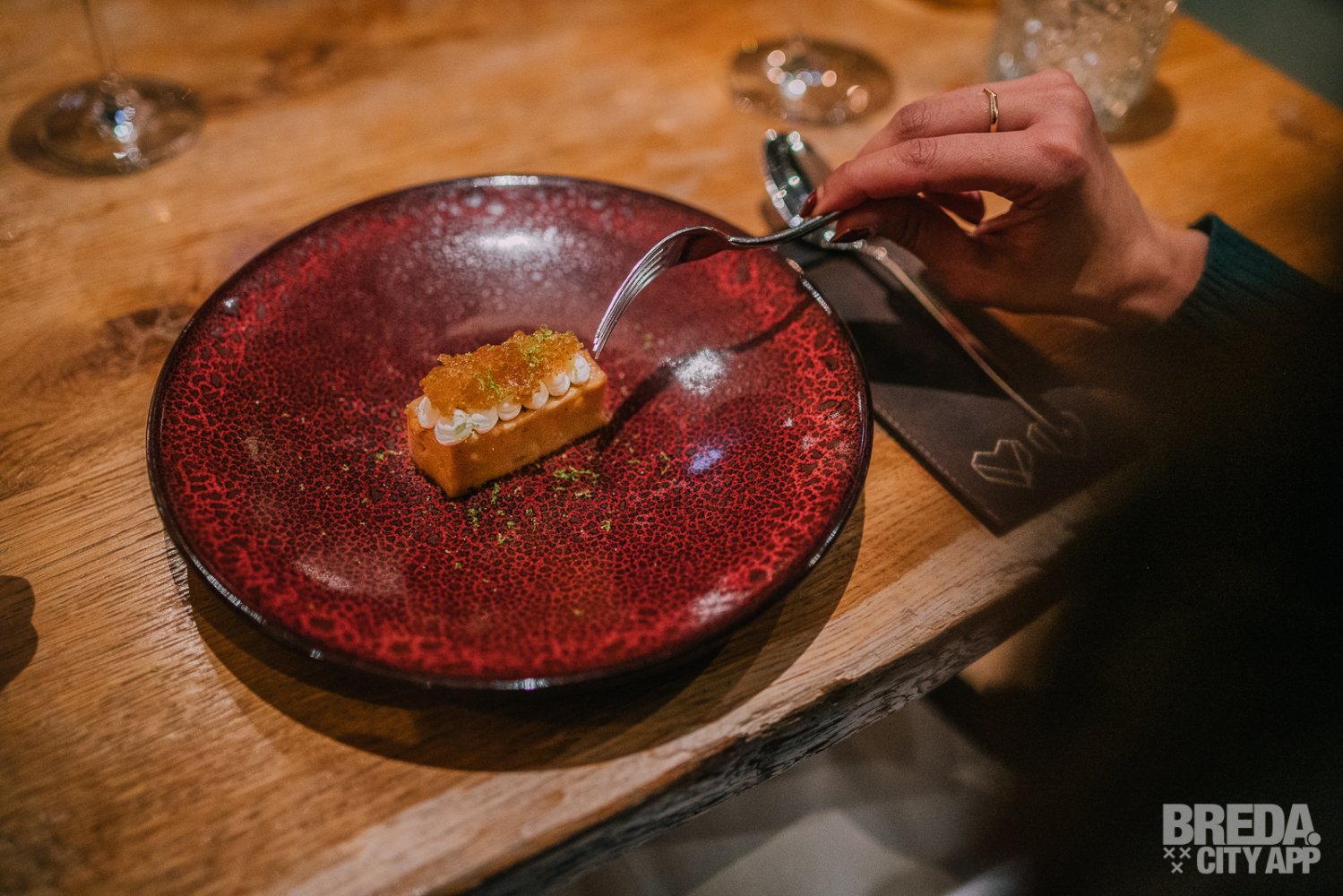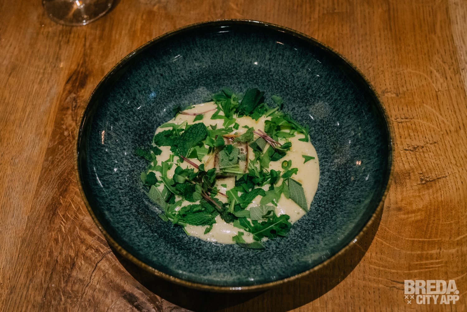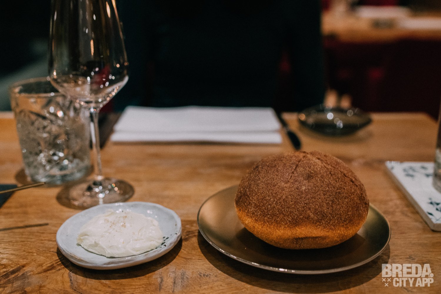 Liefdegesticht is het restaurant van Hotel Nassau Breda en de plek om je culinaire lusten te bevredigen. Bij binnenkomst worden we vriendelijk ontvangen door onze gastvrouw Nina. We nemen plaats aan een gezellige tafel met uitzicht op het water. De culinaire reis starten we met zuurdesembrood geserveerd met gerookte boter en grof zeezout. Het brood is nog warm en heerlijk in combinatie met de luchtige boter. De rooksmaak is subtiel aanwezig maar overheerst niet.