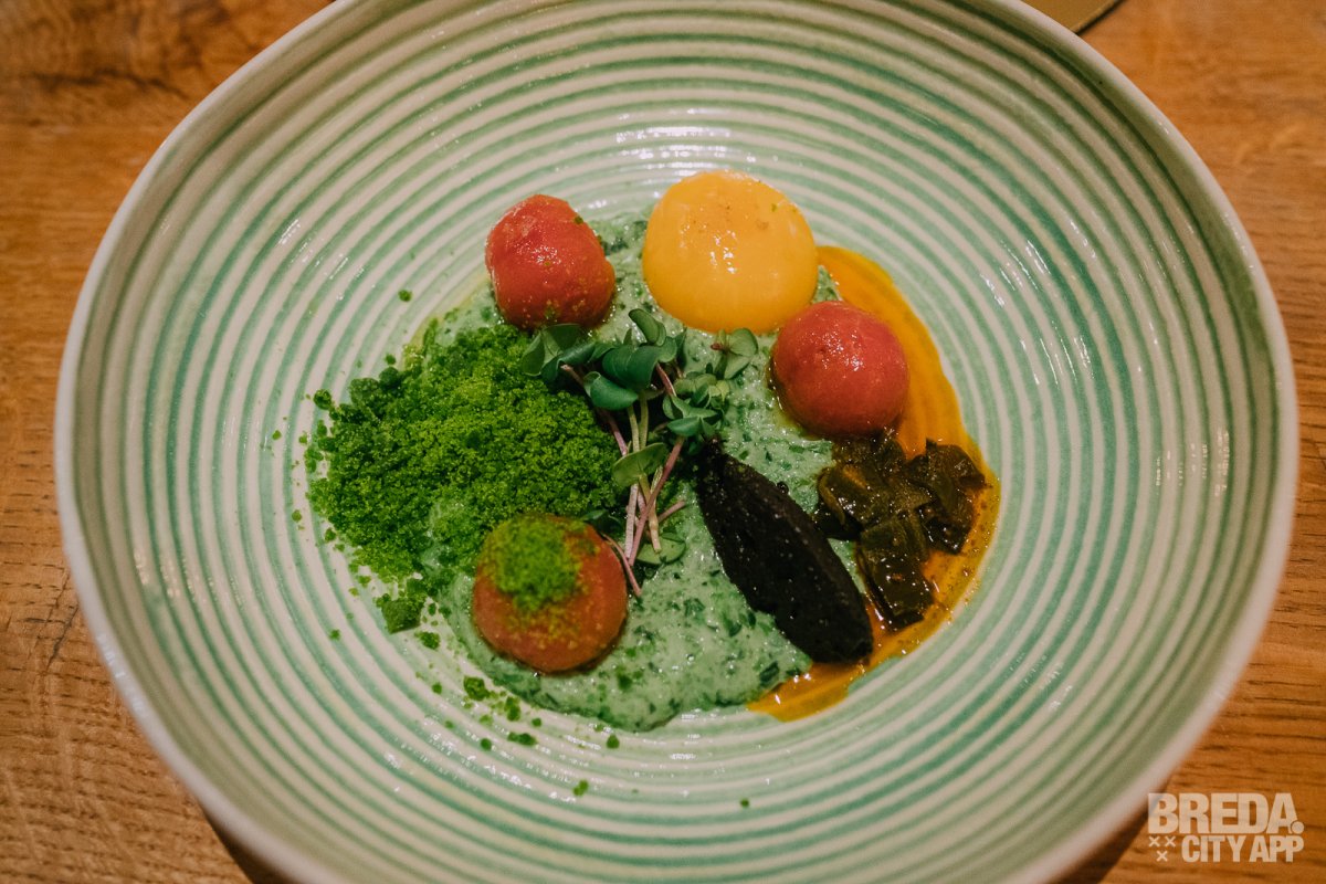 De salade bestaat uit dezelfde geïmpregneerde tomaat, baby gem, een eidooier, kruimel van spinazie en zwarte olijven. Het gerecht is niet alleen een lust voor het oog, maar een absolute smaakexplosie. Het heeft een prachtige balans van verschillende smaken en texturen.