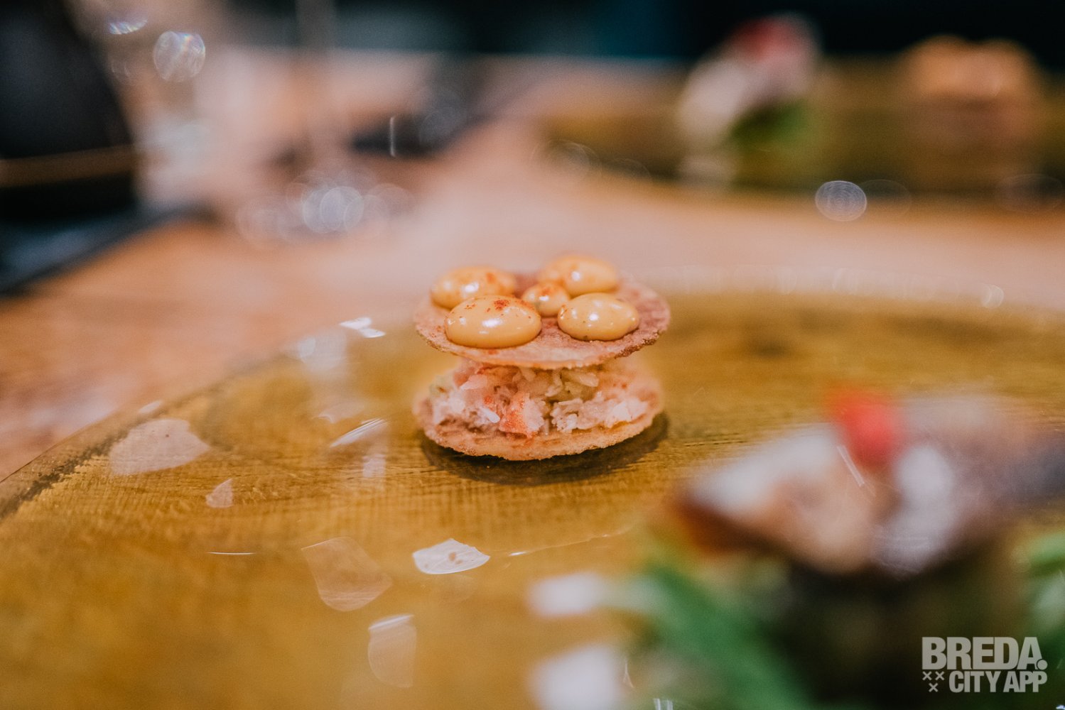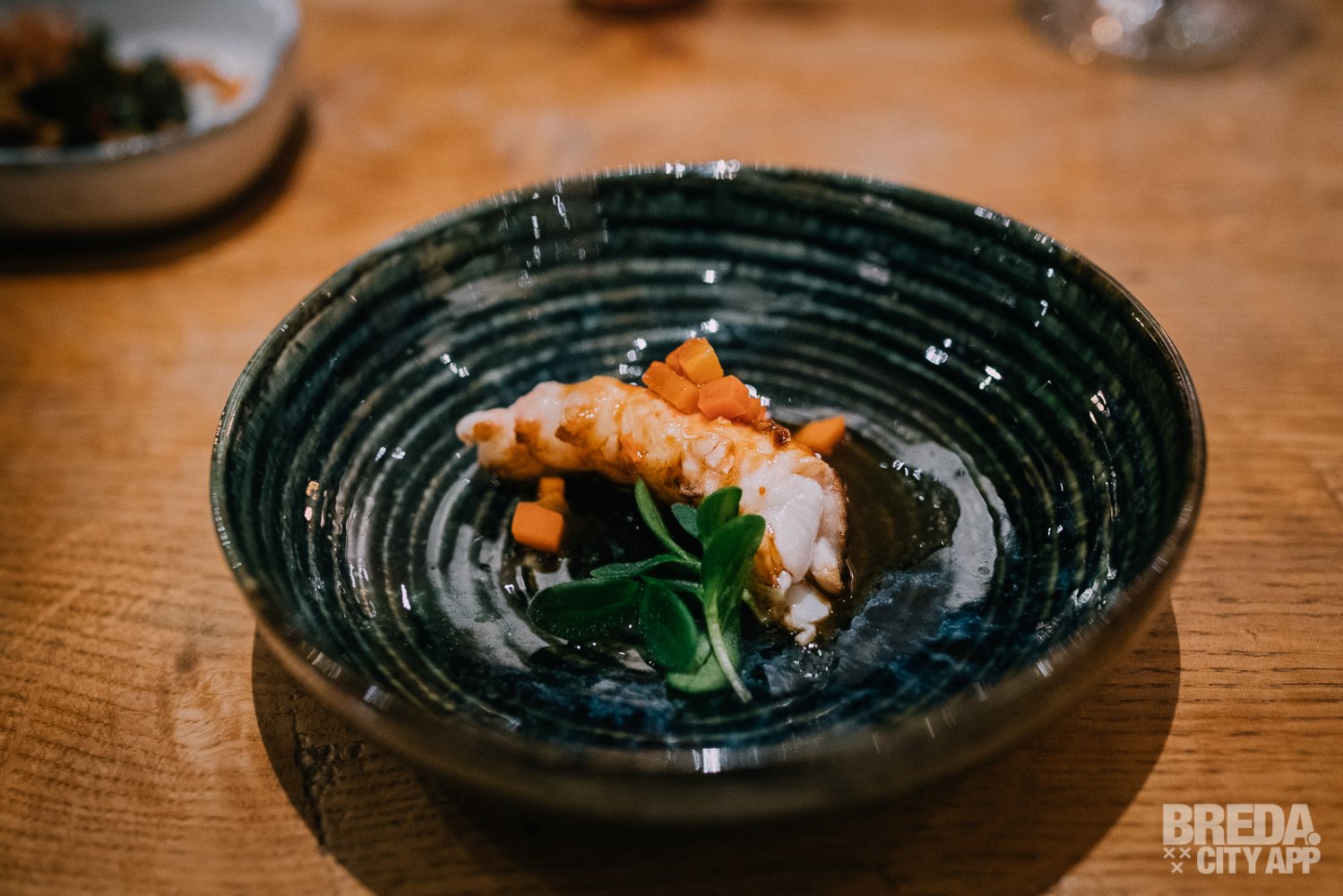 Het tweede gerecht bestaat uit twee kleine hapjes; makreel en een variant op het krab koekje. De makreel ligt op een bedje van sla met avocado tempura en ponzu; een saus die veel wordt gebruikt in de Japanse keuken. De krab wordt geserveerd tussen twee krokante stroopwafel koekjes. We drinken hierbij een 100% Sauvignon Blanc uit Nieuw Zeeland, welke mooi samen gaat met het vettige van de vis en een fijne balans aan zuren toevoegt.