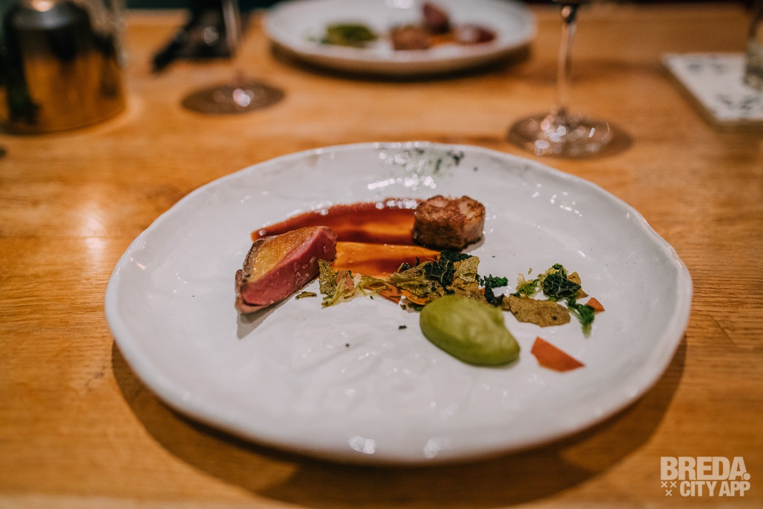 Het zevende gerecht is een filet van duif met een mouse van pistache en foie gras, een gratin en gefrituurde salie. Een leuke verrassing was dat chefkok Pando aan tafel kwam om de jus over het vlees uit te schenken.