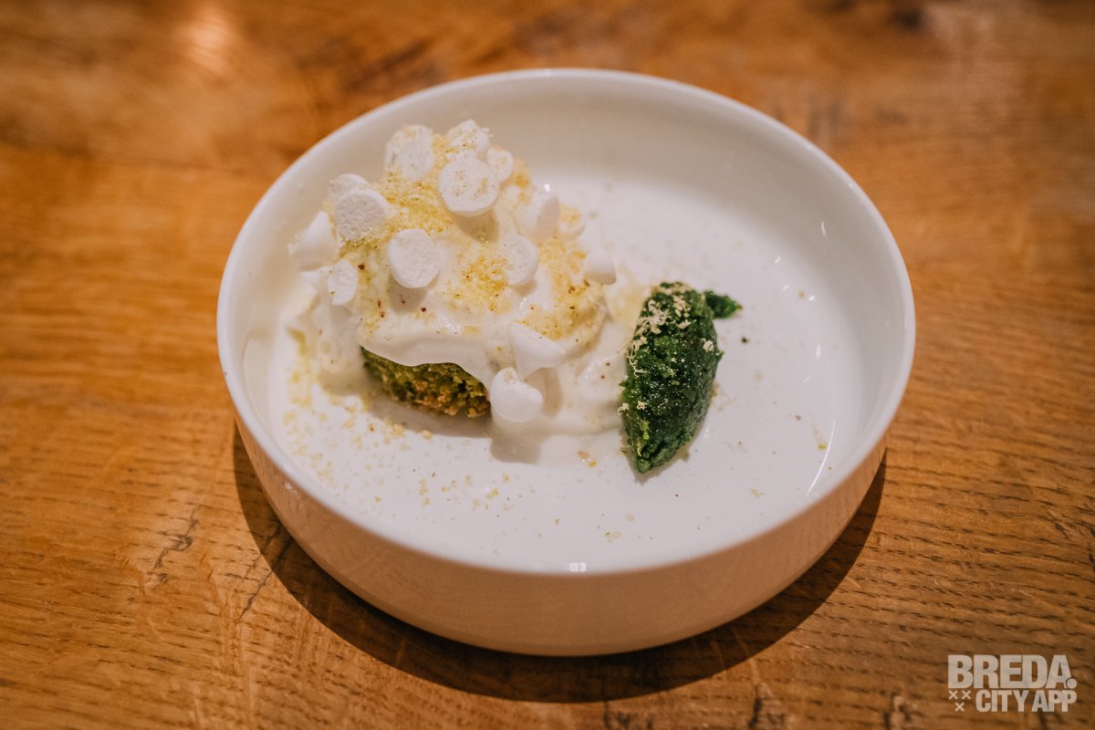 De achtste gang is een taartje van pistache met citroen ijs, bergamot, kumquat en stukjes merengue. Het taartje is vol en romig, wat mooi samen gaat met de frisse smaak van het ijs. We drinken hierbij een Spätlese van Tschida uit Oostenrijk.