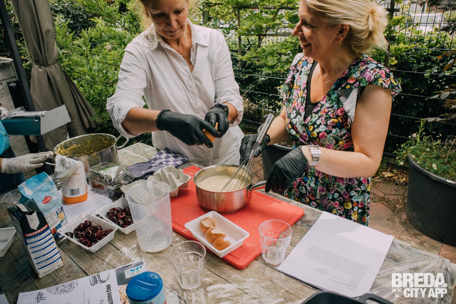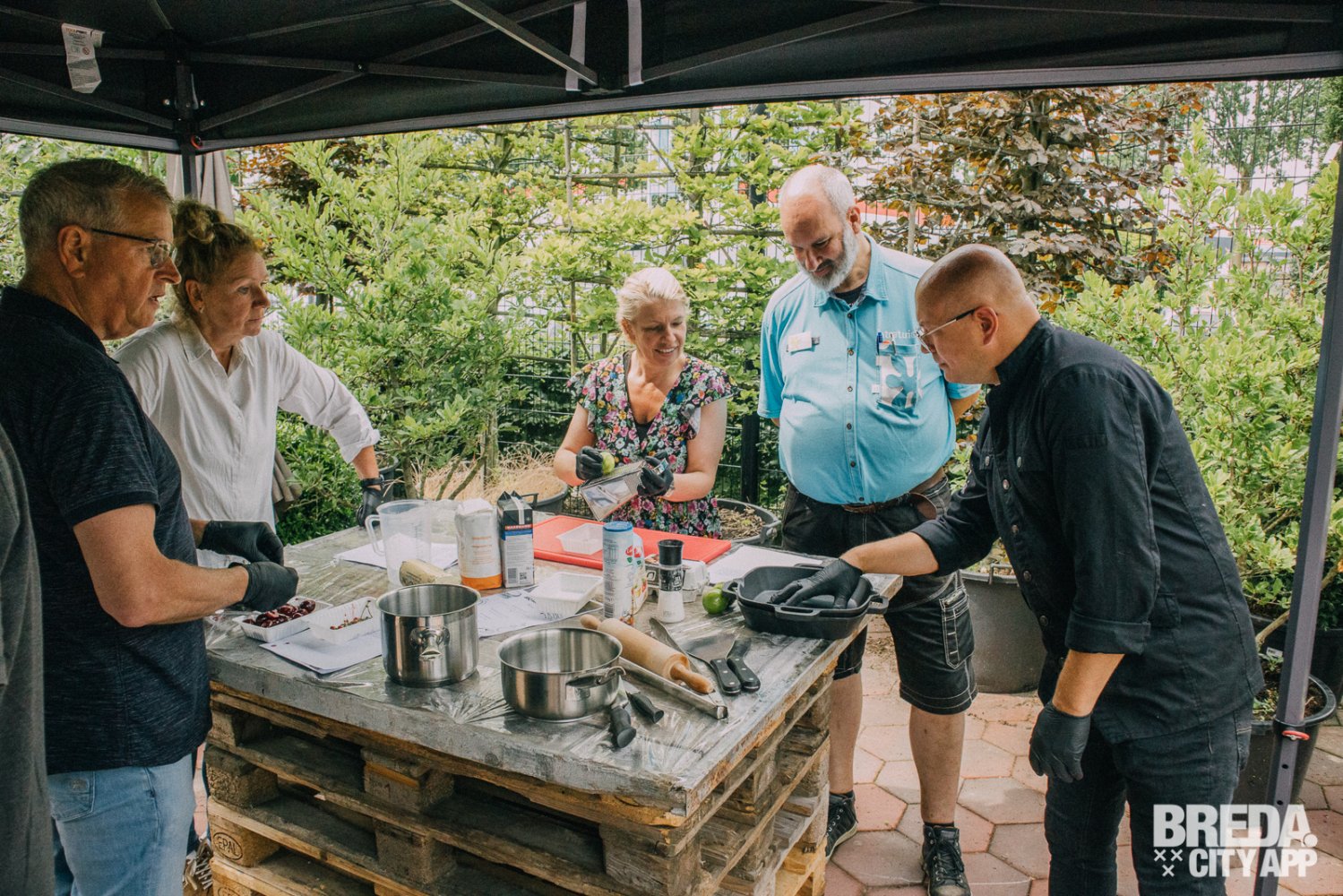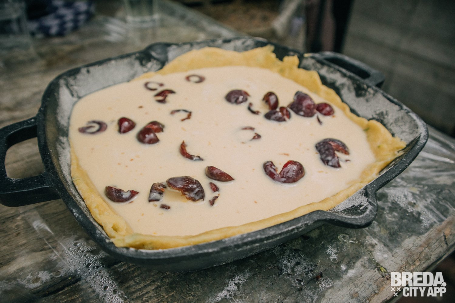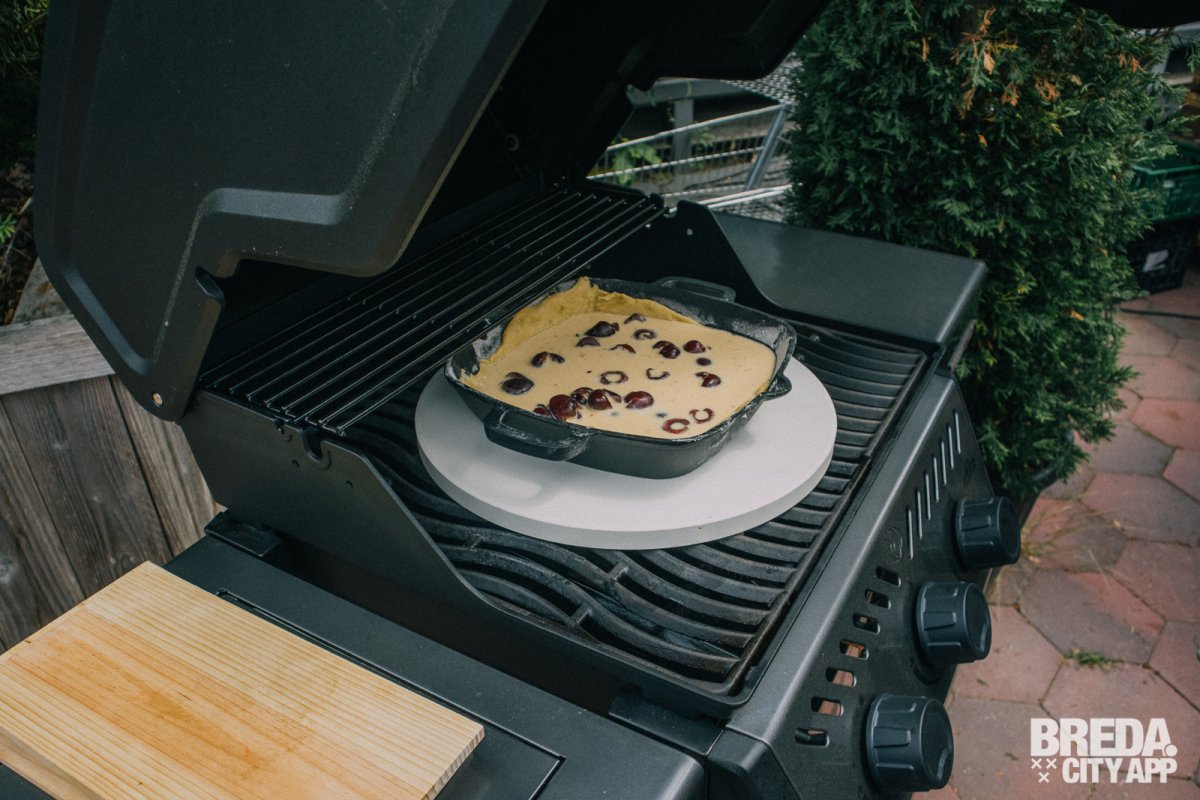 De vierde groep gaat beginnen met het nagerecht; een heerlijke kersenclafoutis met vanille roomijs. Dit blijkt dus een taart te zijn! Wie had ooit gedacht dat je een taart kan bakken op een bbq? We worden ingedeeld in groep 4 en hebben het erg gezellig met 2 andere deelnemers. gebroederlijk maken we het gerecht klaar. Danny gaart een taart op The Basterd en een taart op de Napoleon zodat we kunnen zien dat beiden geschikt zijn om taarten te bakken. Dries zorgt dat alle ingrediënten aangevuld worden, vuile messen worden opgehaald en schone planken worden gebracht. Danny loopt rond om te helpen en vragen te beantwoorden. Ondertussen lopen we eens naar de buren om te kijken hoe het met de andere gerechten staat. Gezellig kletsend komen we er achter dat er mensen vanuit België zijn gekomen maar ook Ridderkerk en Rotterdam.