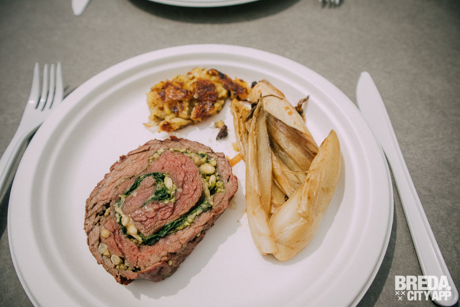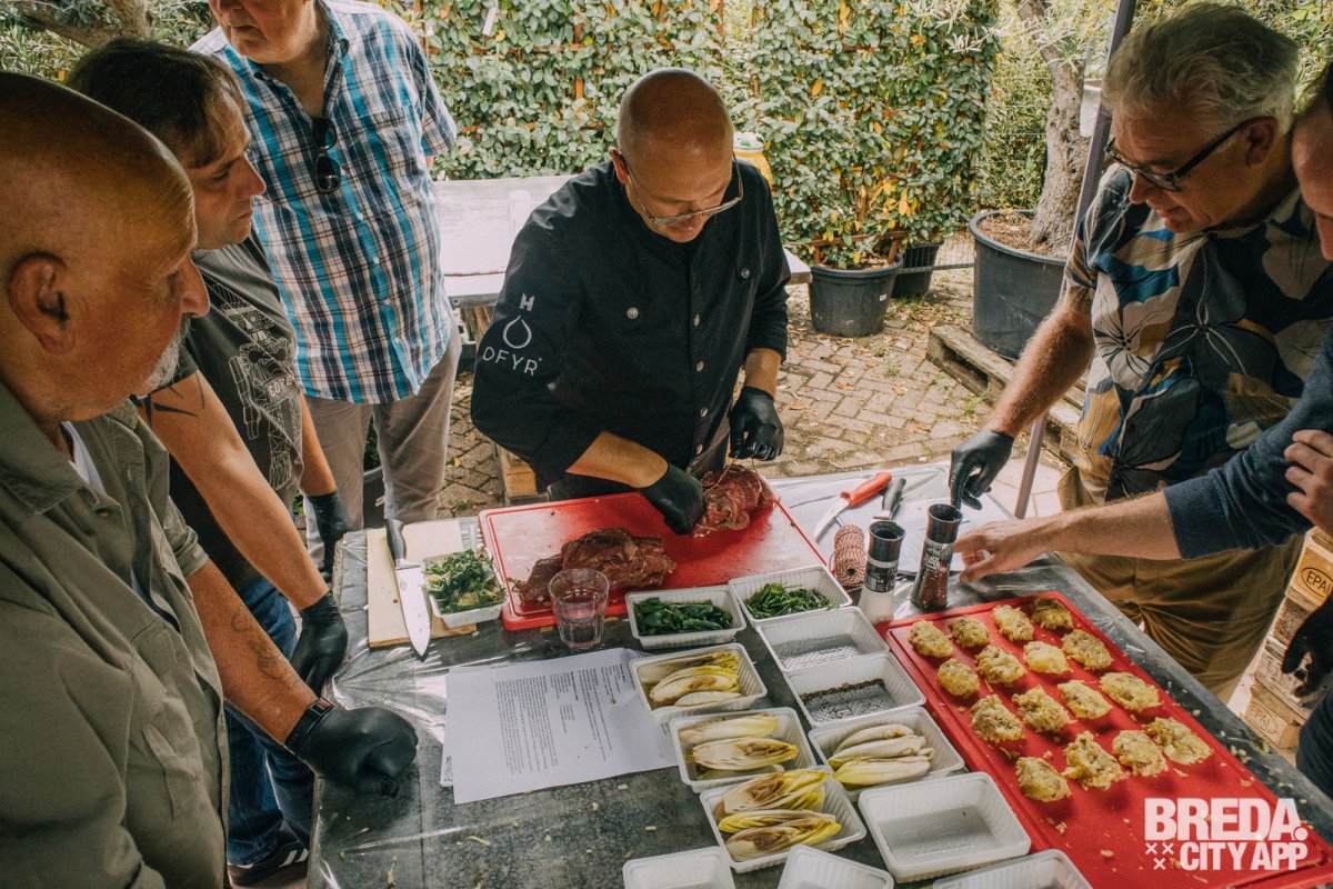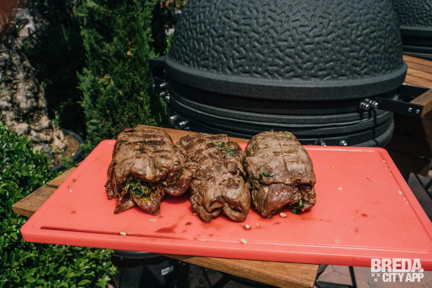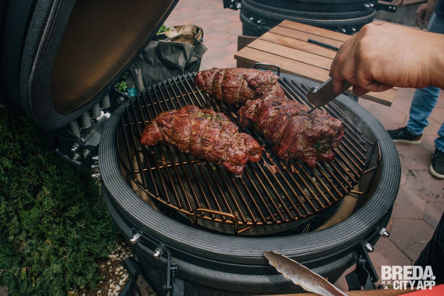 Twee groepen beginnen ondertussen aan het hoofdgerecht; bavette carpaccio-rollade met rösti en gegrilde witlof. Prachtige stukken vlees worden er bereid. Met veel geduld gaart het vlees waarbij heerlijke geuren vrijkomen. Eerst wordt het vlees op de Ofryr gegaard om vervolgens na te garen op the Basterd. De rösti wordt bereid en ook de witlof wordt gegrild. Deze worden ook op de Ofry bereid. Tijdens het bereiden loopt het water al in onze mond. Het geeft ons veel zelfvertrouwen dat we dit zelf zo mooi klaargemaakt hebben. Dat gaat straks thuis zeker ook lukken!