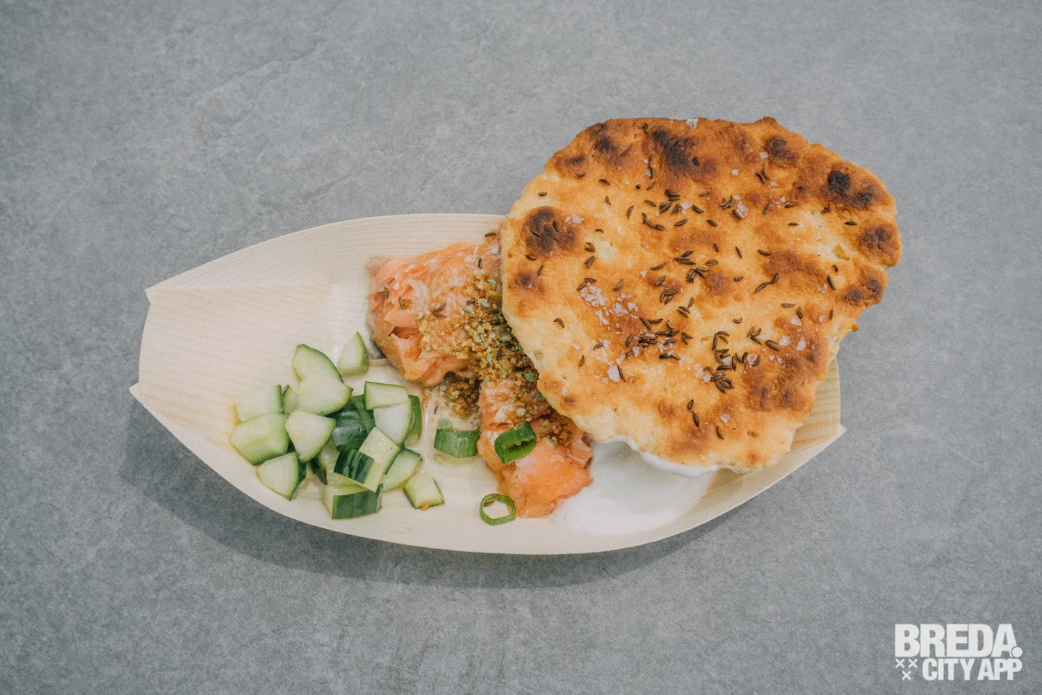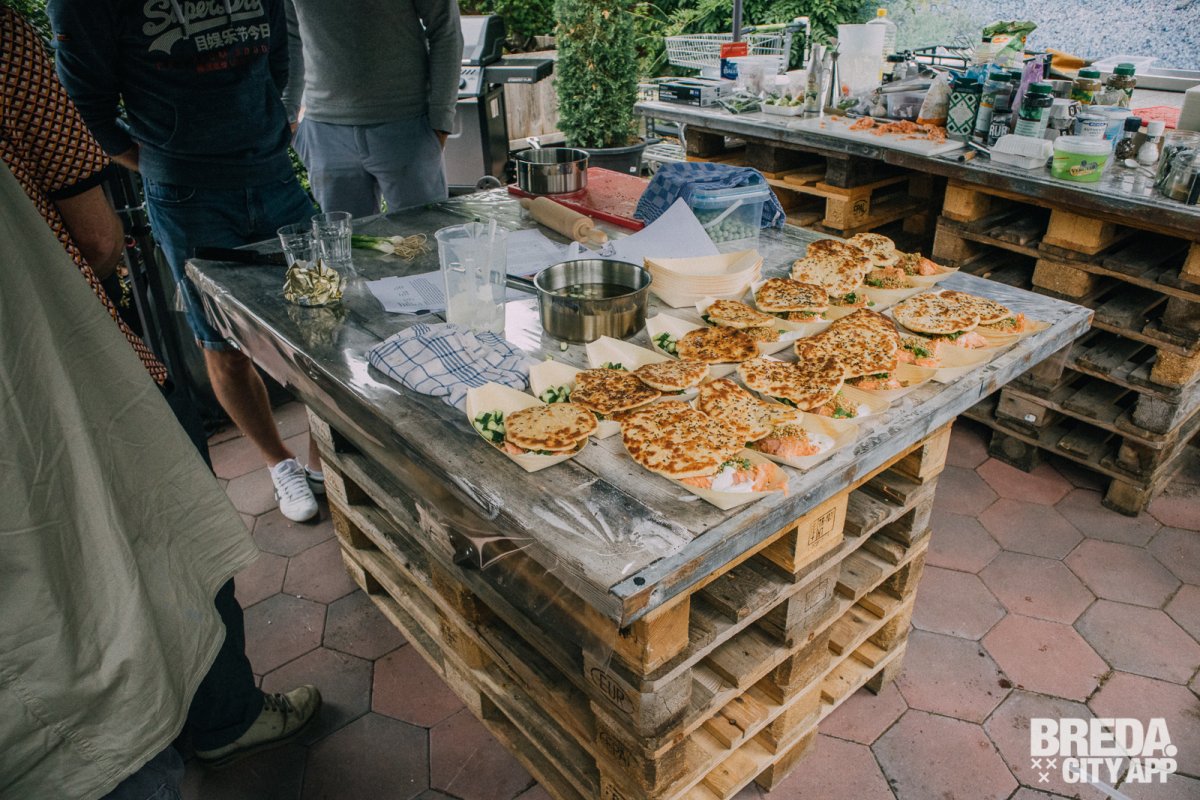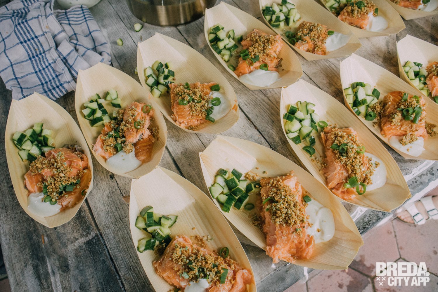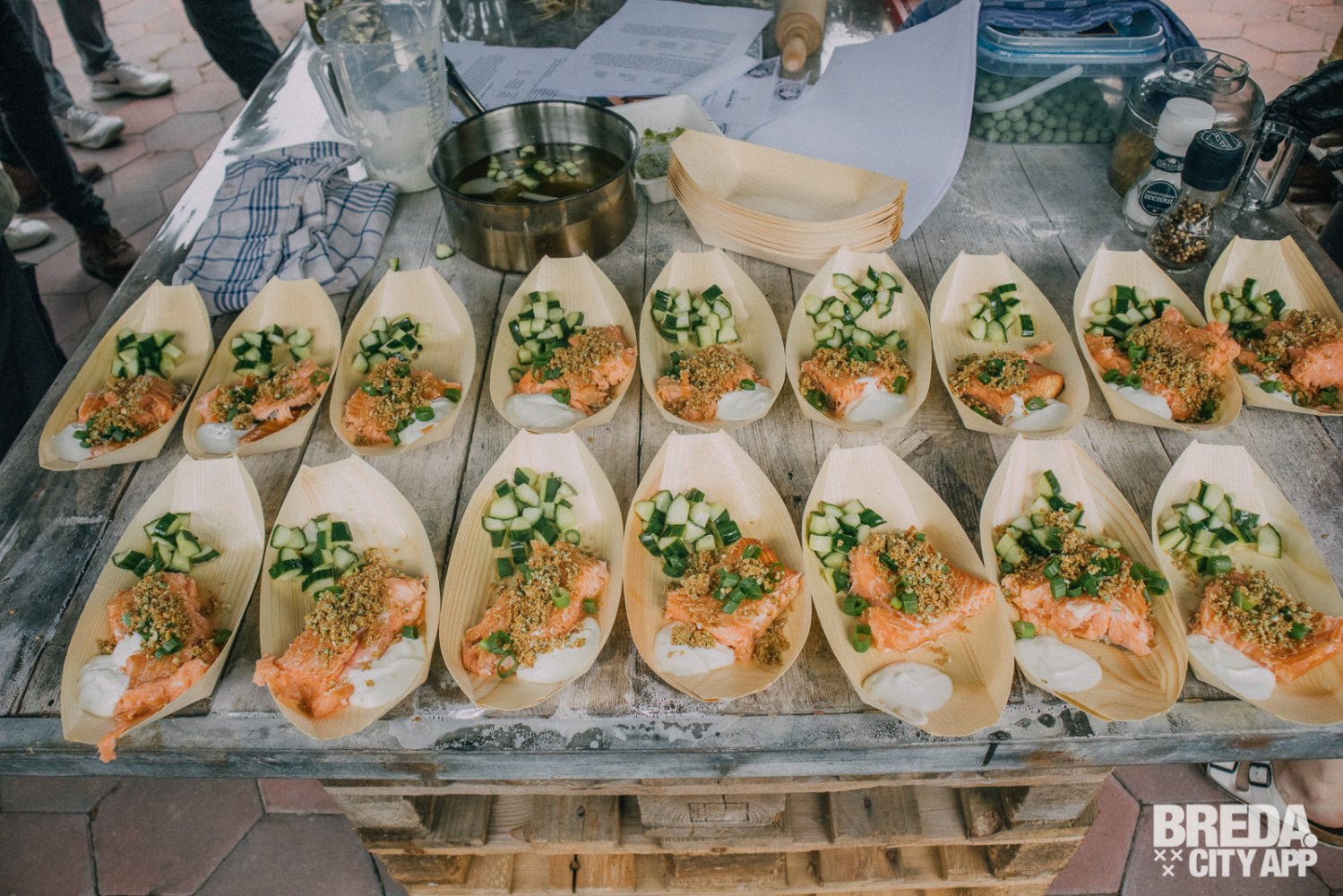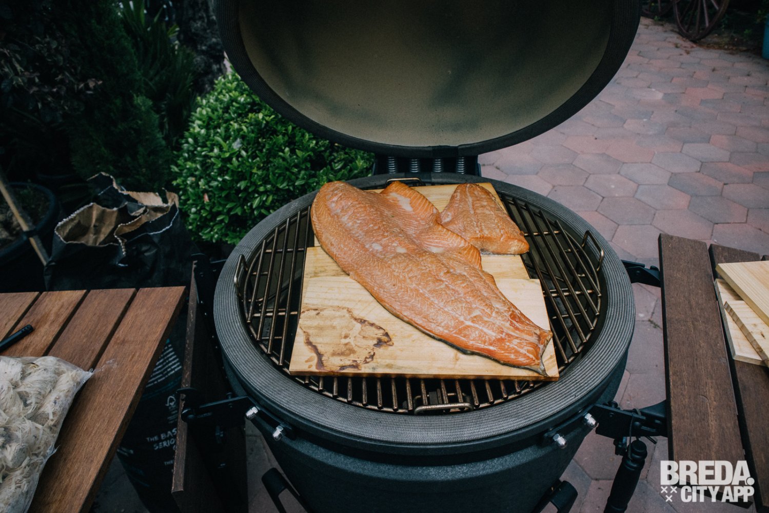 We worden in 4 groepjes verdeeld. De eerste groep gaat aan de slag met het voorgerecht. Het voorgerecht is een warm gerookte zalm met een zoetzuur van komkommer, crème van Griekse yoghurt en een wasabi crumble aangevuld met zelfgebakken brood. De zalm is vooraf gepekeld maar ziet er al prachtig uit . Deze wordt gegaard op steenkolen in the Basterd.