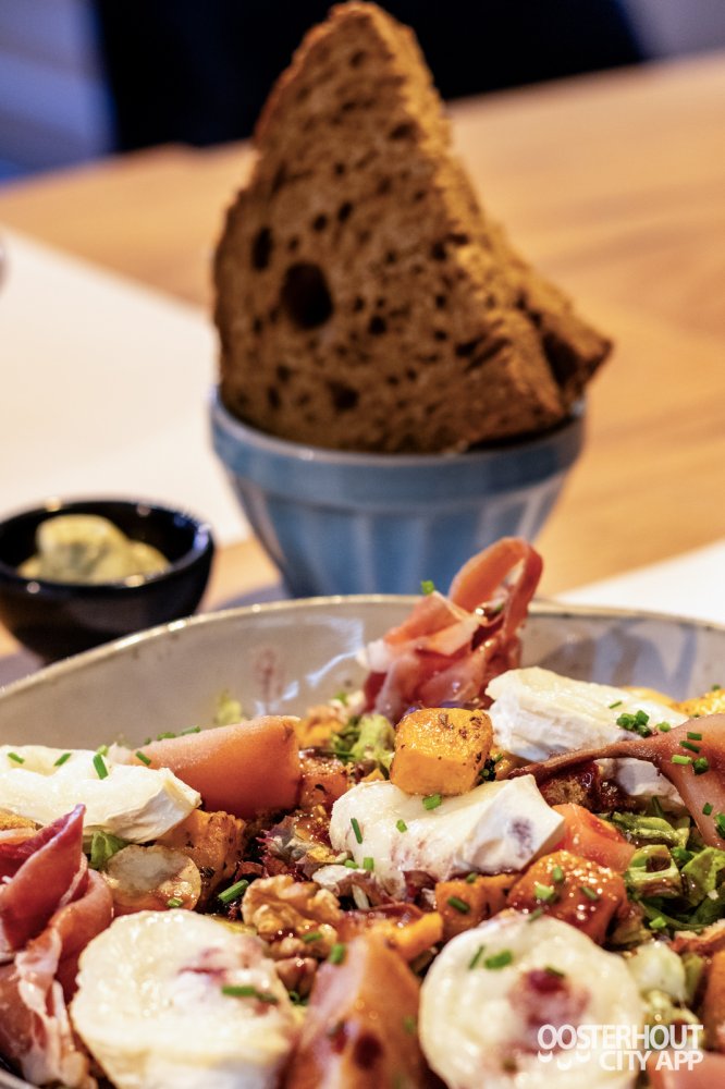 We krijgen van Sandra een proeverij van de nieuwe kaart aangeboden. We starten met een herfstsalade. Dit is een smaakvolle start van ons bezoek. De dadels, pompoen, ham en geitenkaas maken de salade goed gevuld. De robuuste smaak van het bier vult de subtiele tonen van de salade aan. We geven een compliment over de lekkere salade aan de gastvrouw die de borden komt uithalen.