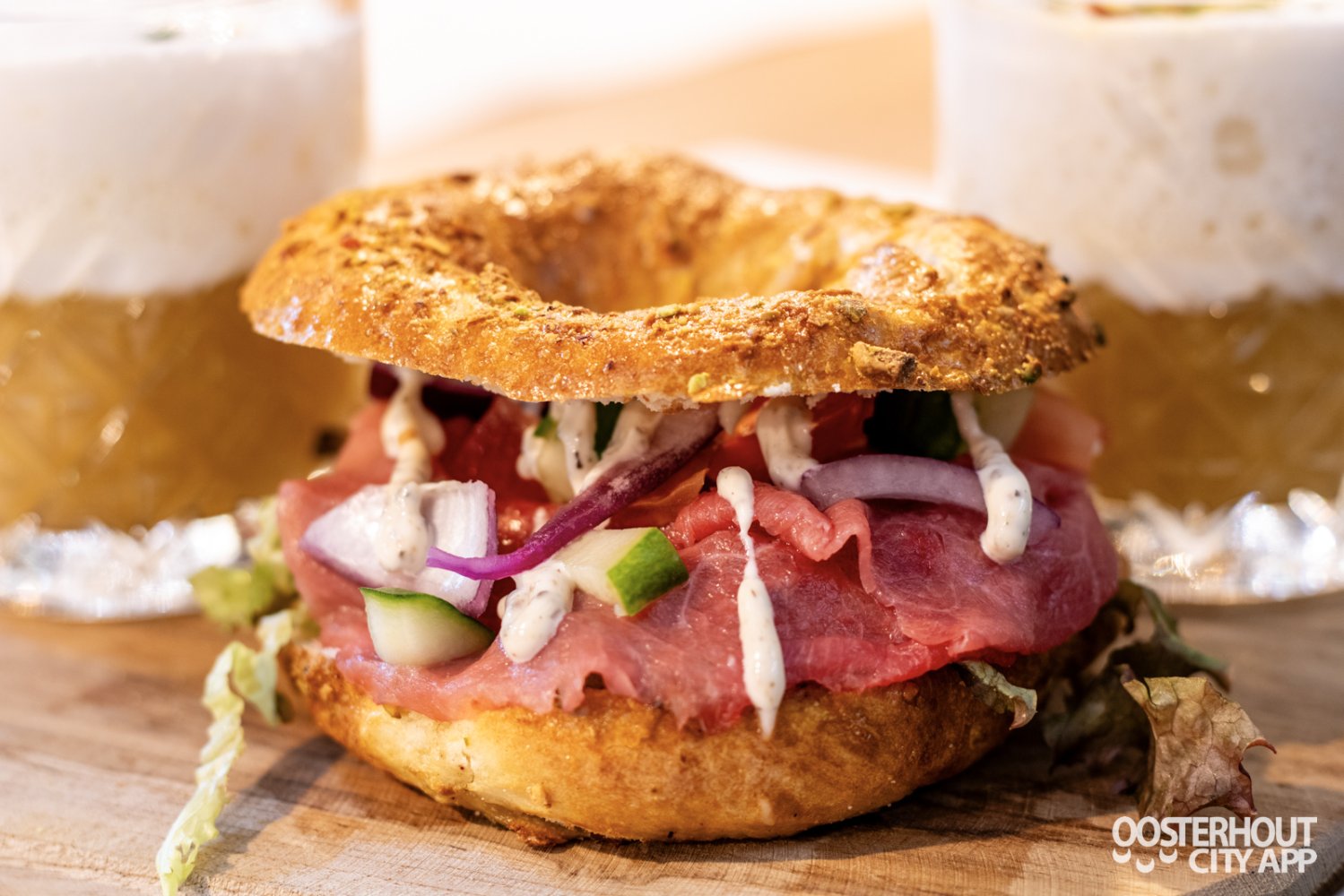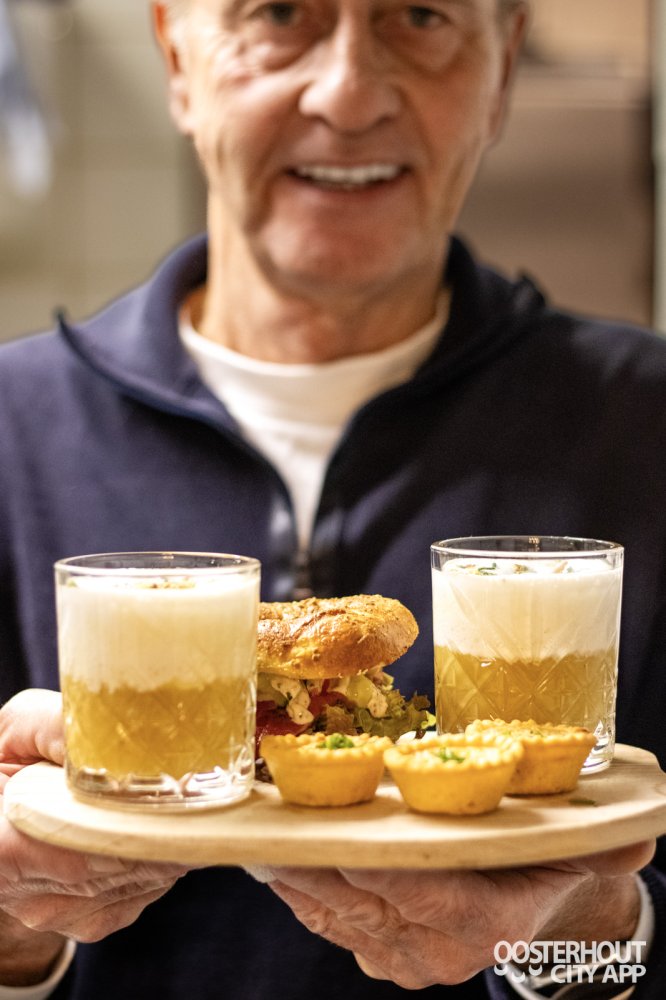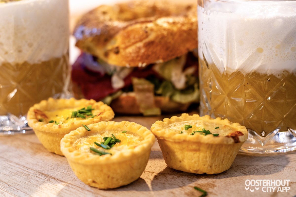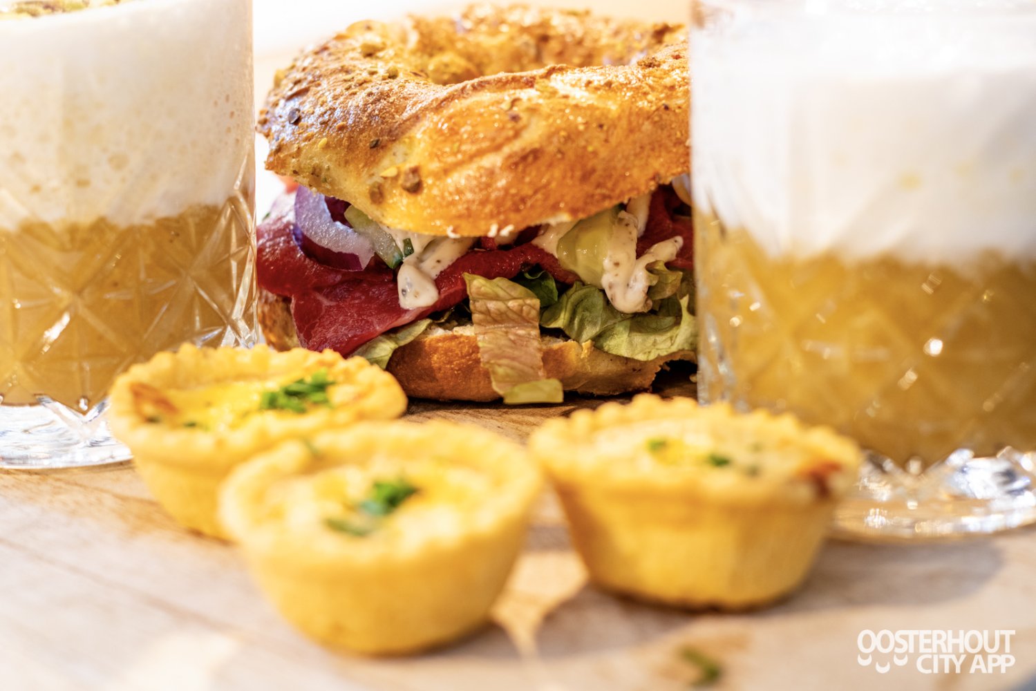 Opvolgend krijgen wij de gezellige winterplank gepresenteerd. De plank is goed gevuld met diverse smaken en texturen. De bagel met carpaccio is een feest van mals vlees, truffel mayonaise en frisse sla. De quiches voegen een hartige touch toe, terwijl de ‘souppuccino‘ van ui een warme, verrassende aanvulling is. De plank is een uitnodiging om te delen en te genieten van verschillende smaakcombinaties.