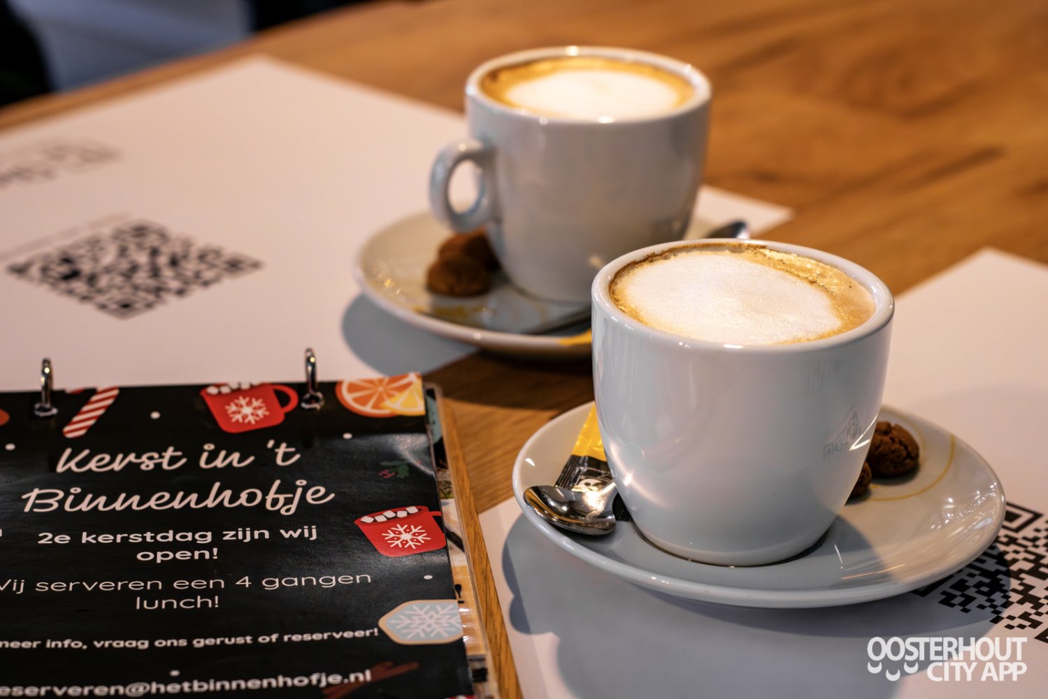 Bij binnenkomst in Brasserie het Binnenhofje worden we direct warm en hartelijk ontvangen. De geur van versgemalen koffiebonen vult de lucht, en de warmte van de ouderwetse kachel geeft een knus thuis gevoel. We worden uitgenodigd om plaats te nemen aan de nieuwe tafels. Een warme cappuccino met kruidnootjes staat al snel voor ons op tafel, waardoor we op een aangename manier kunnen opwarmen. De brasserie is al aardig vol en het rumoer van de andere gasten geeft een extra gezellige dimensie aan ons bezoek.