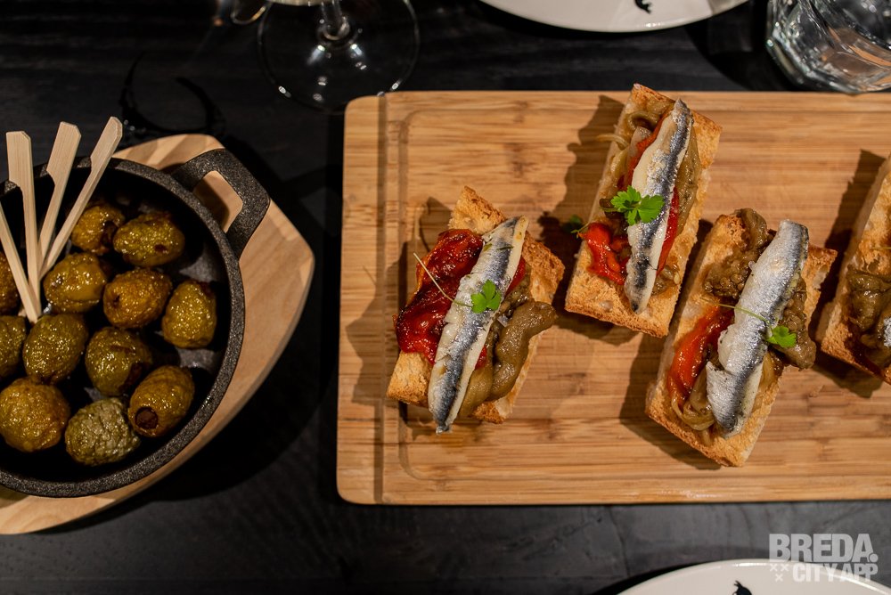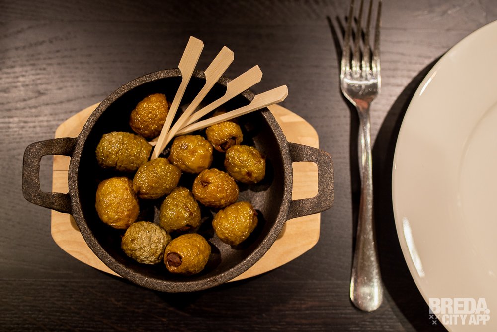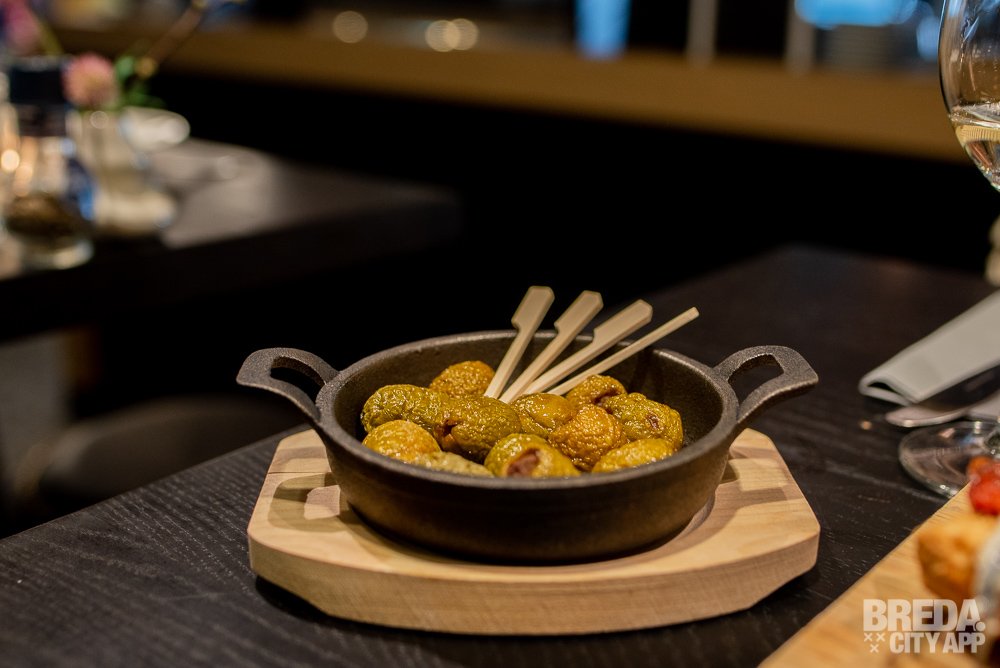 Naast de knapperige en smaakvolle toasts worden gefrituurde olijven geserveerd die met gehakt uit Ampurdan gevuld zijn. Voor ons is dit de eerste, maar zeker niet de laatste keer dat wij olijven proeven die op deze manier bereid zijn. Het frituren van de olijven zorgt ervoor dat ze nét wat meer bite krijgen en het gehakt is heerlijk op smaak. Een aanrader!