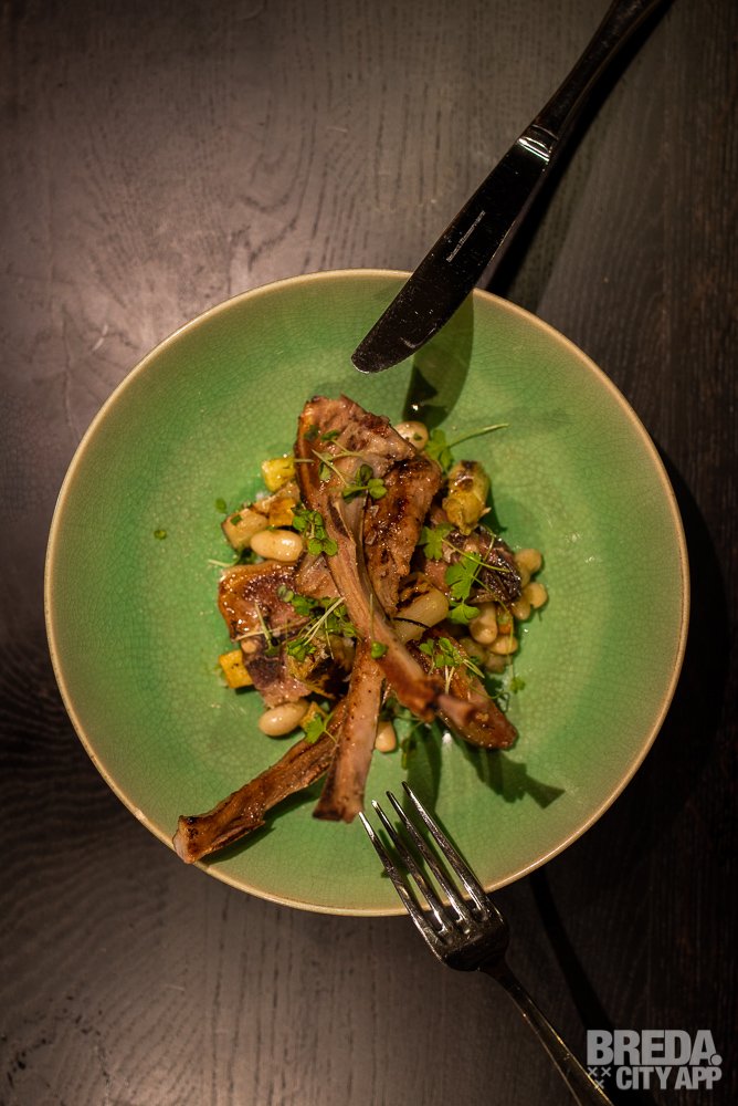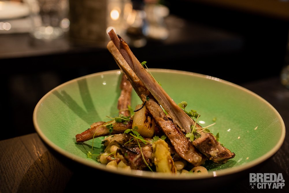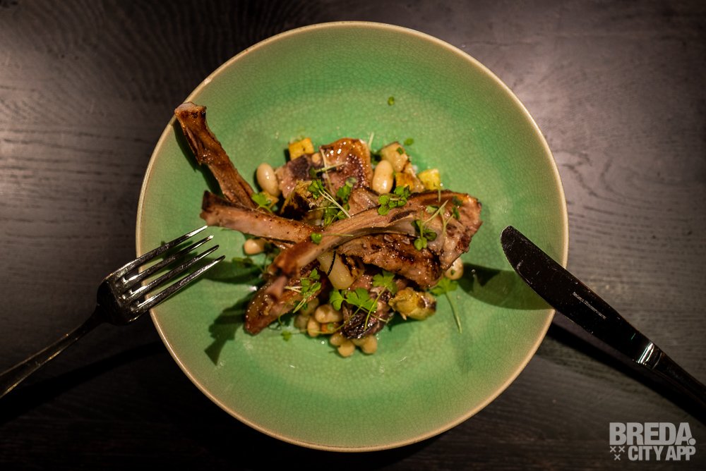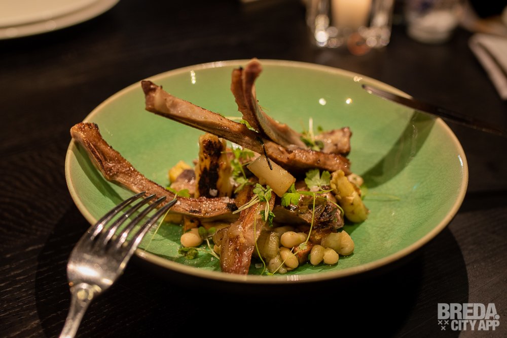 Naast de gamba's wordt een gerecht geserveerd met lamskoteletjes. Het malse, sappige vlees gaat tezamen met witte bonen, brunoise van krokant gebakken aardappeltjes en asperges. Hierbij wordt verse aioli geserveerd. Wederom een gerecht waar wij geen genoeg van kunnen krijgen. Alles is zo goed op smaak dat het peper- en zoutvaatje de hele avond onaangeraakt zijn gebleven.