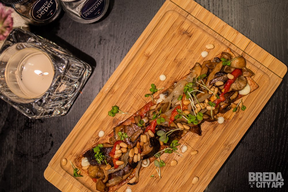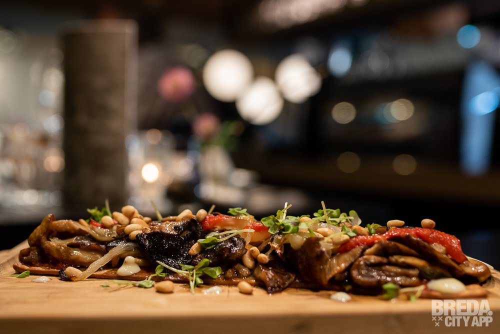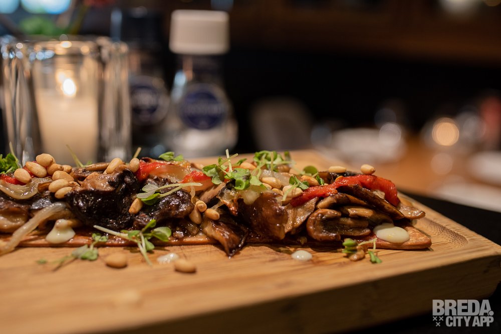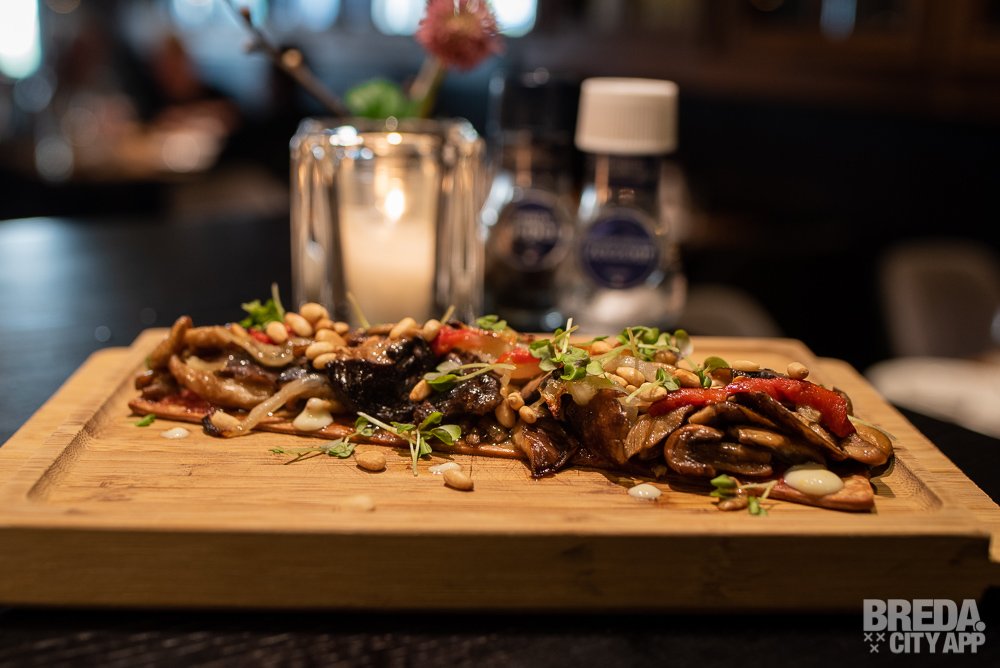 Voor we naar de desserts gaan bestellen we nog een van de vegetarische gerechten die de menukaart van Gaudim rijk is. We gaan voor de Coca de bolets, pebrot pinyons i salsa de llimona. Dit is een paddenstoelentaartje met paprika, pijnpoompitten en een frisse, crème-achtige saus van limoen. Ook voor de niet-vegetariërs onder ons is dit een absolute aanrader.