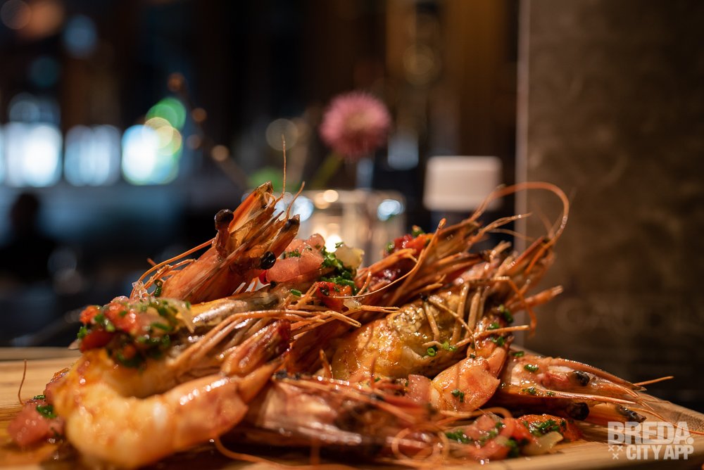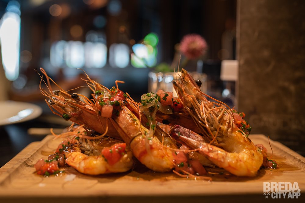 Na de kroketjes worden we blij verrast door een zestal grote gamba's van de plancha. Het is bijna zonde om van te eten, zo mooi is dit gerecht opgemaakt. De gamba's zijn overgoten met een smaakvolle vinaigrette van paprika en watermeloen en we kunnen je vertellen, dat is een verrukkelijke combinatie!