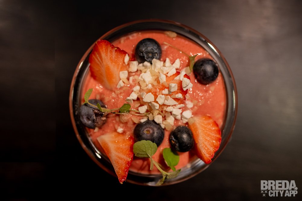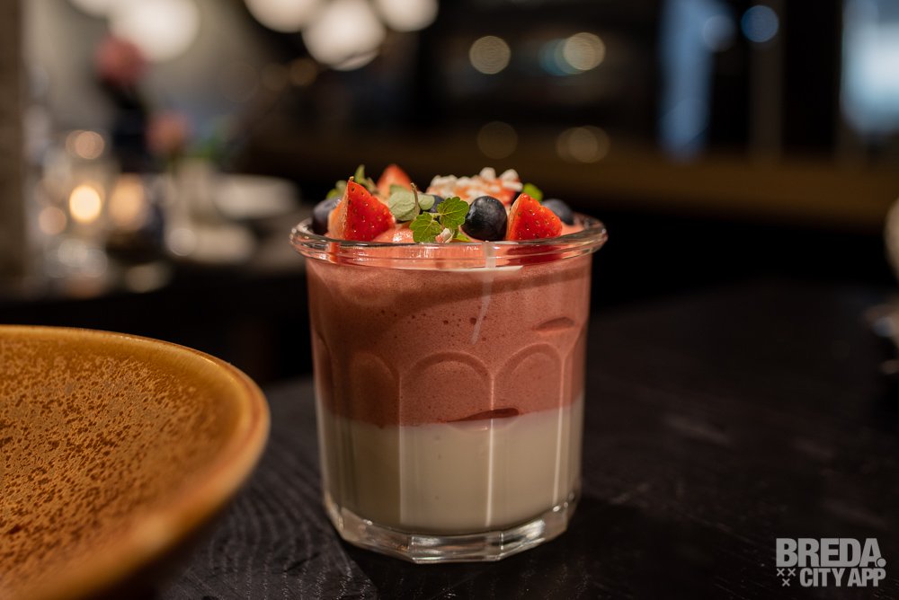 We sluiten deze fijne avond af met twee prachtige desserts. Een daarvan is de Semifred de llimona. Het dessert is opgebouwd in lagen, waarvan de onderste laag een limoencrème is en de bovenste een aardbeien espuma. Het zoete van de luchtige espuma weegt perfect af tegen de friszure smaak van de limoencrème.