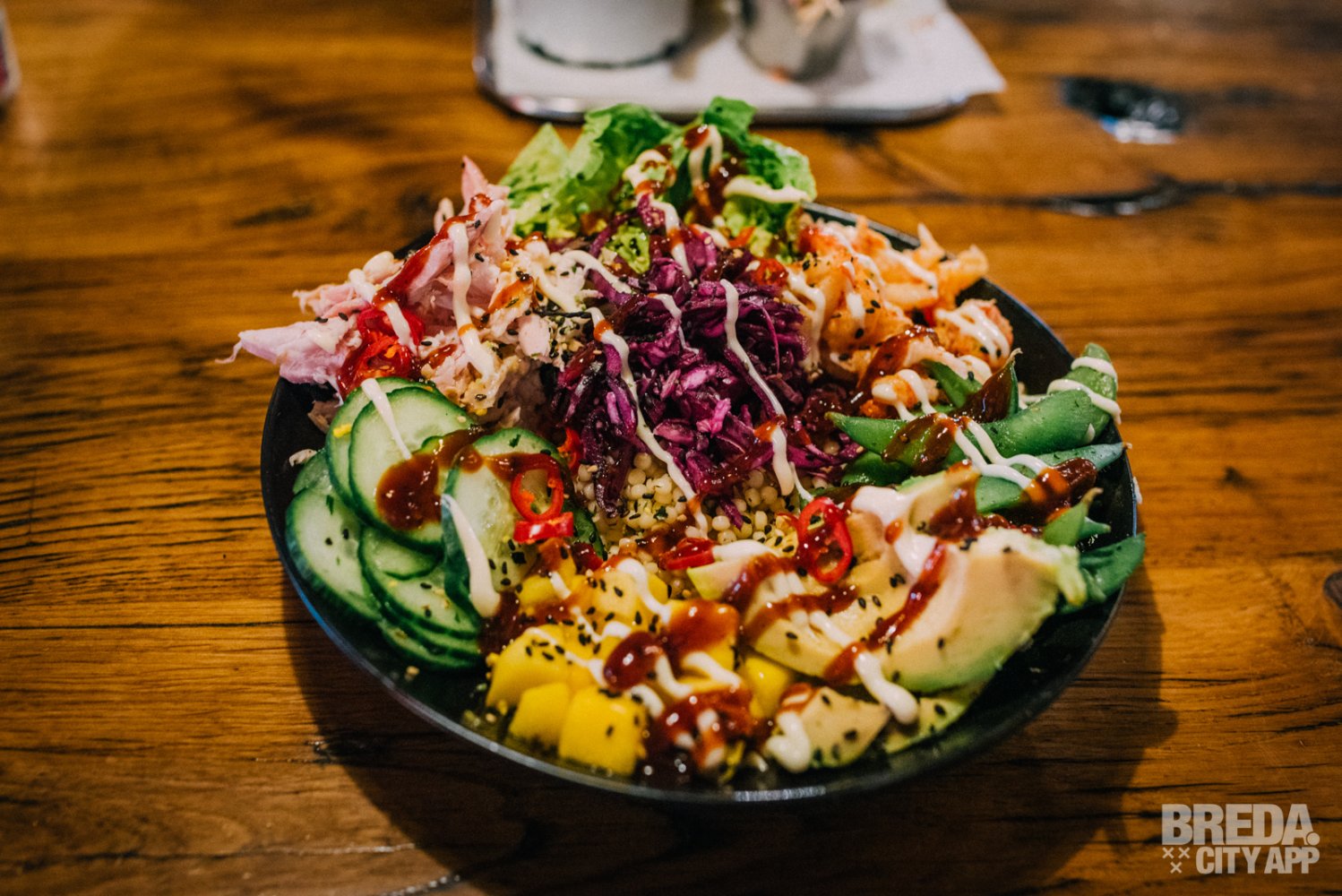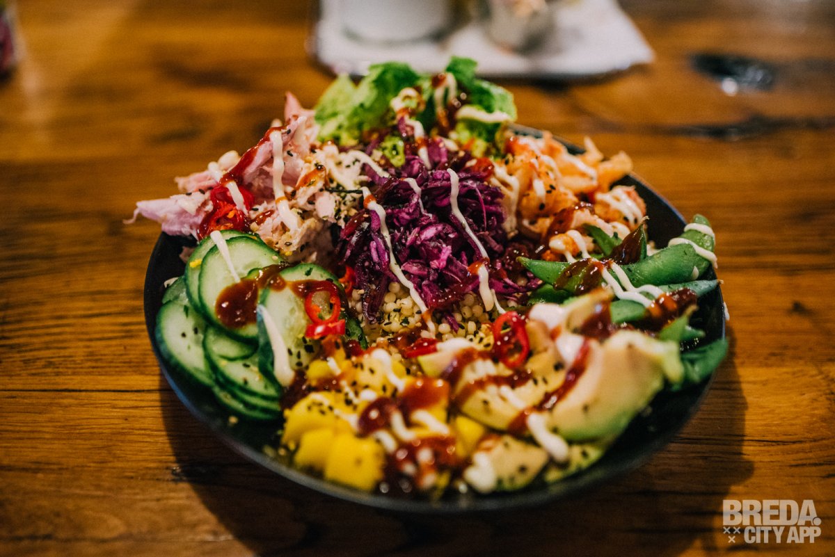 Ondertussen wordt het eten geserveerd. We beginnen met een surf en turf bowl. Dit gerecht is een kleurig plaatje en bevat kreeft, pulled chicken, avocado, mango, komkommer, rode kool, edamame, little gem en parelcouscous. Rijk gevuld en zeker genoeg voor een maaltijd. De kip wordt koud geserveerd maar is ontzettend mals. De rode chili pepers geven het gerecht flink wat pit en de wasabi mayonaise maakt het geheel lekker romig.