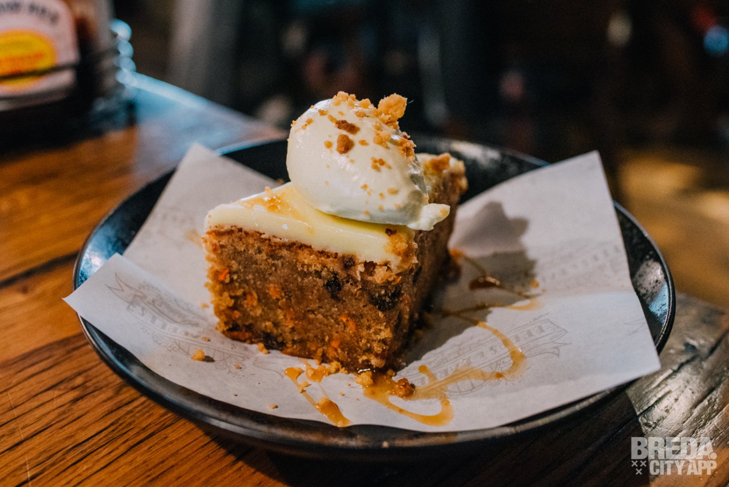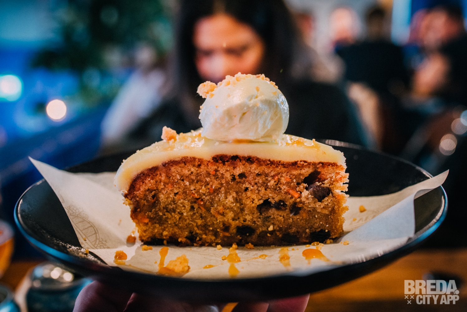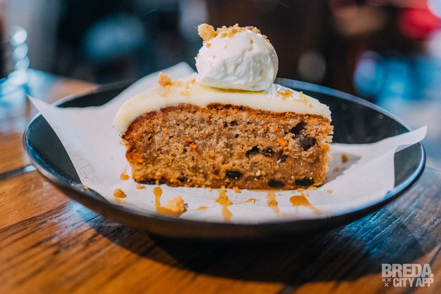 We sluiten de avond af met een klassieke carrotcake. Geserveerd met een dikke mousse van gember en limoen op de top . De gember geeft het een frisse smaak en de limoen zorgt voor een zuurtje. De carrotcake bevat krentjes en er zijn duidelijk stukjes wortel zichtbaar. Al met al een heerlijke carrotcake.