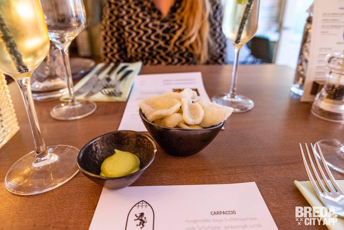 Daarbij krijgen we zelfgemaakte kroepoek met wasabimayonaise en citroen-zeezout broodjes met gezouten roomboter, gerookt zeezout en olijfolie vooraf.