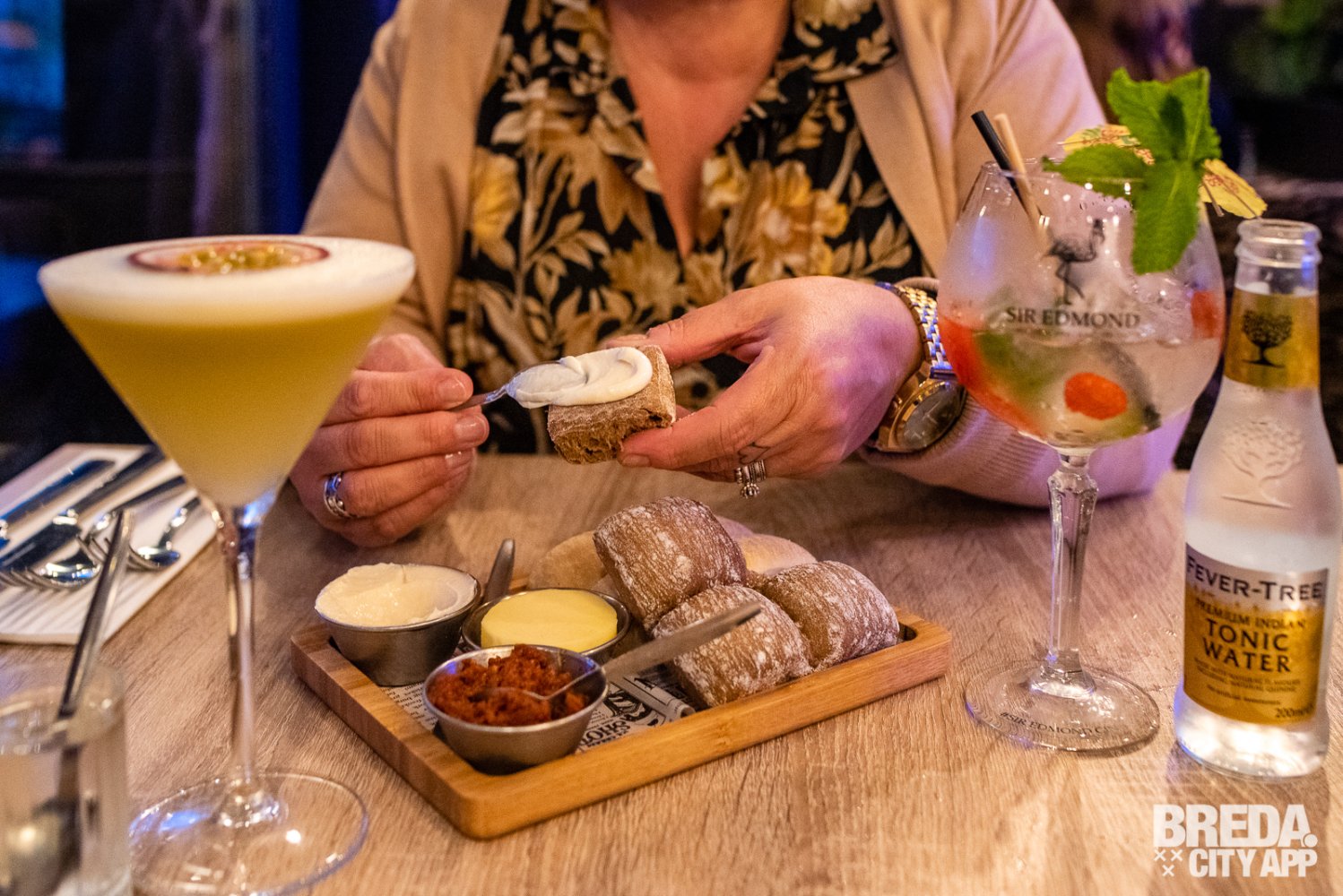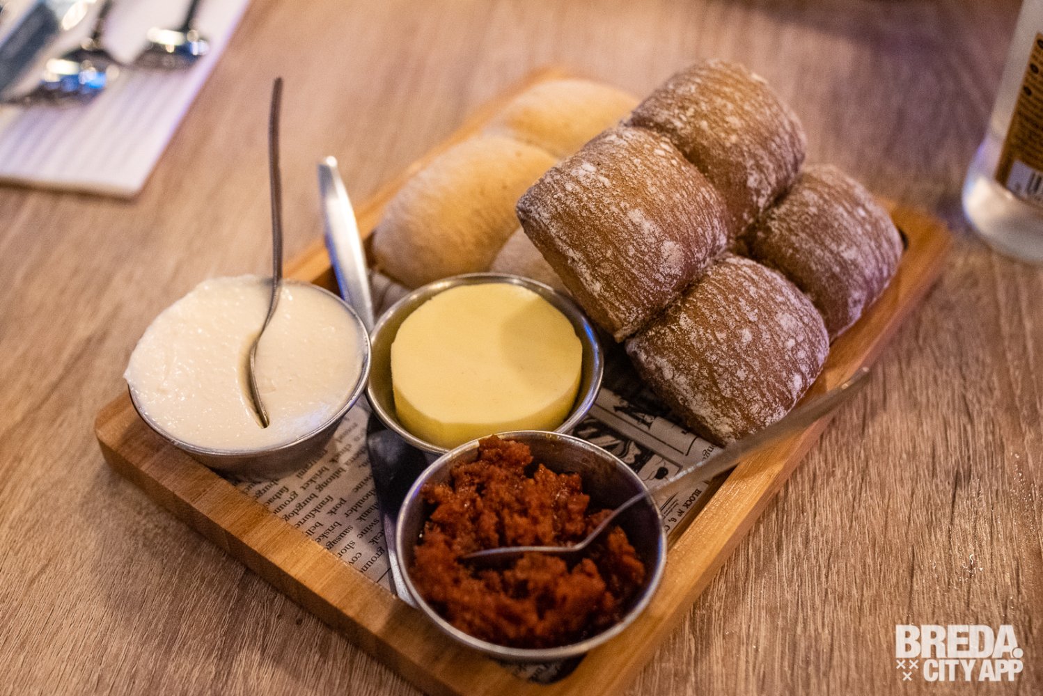 Als eerste wordt er breekbrood met aioli, boter en tapenade geserveerd. Het brood is nog een beetje warm wat het nóg lekkerder maakt. Ondertussen proeven wij van onze drankjes, de Pornstar Martini heeft een volle passievrucht-smaak en is afgemaakt met een halve passievrucht en een shot prosecco. De gin tonic wordt geserveerd met aardbei en munt en is lekker fris en zoet. Op de kaart van Blue dog staan maar liefst 8 cocktails en 8 gin tonics waar men uit kan kiezen. Voor ieder wat wils!
