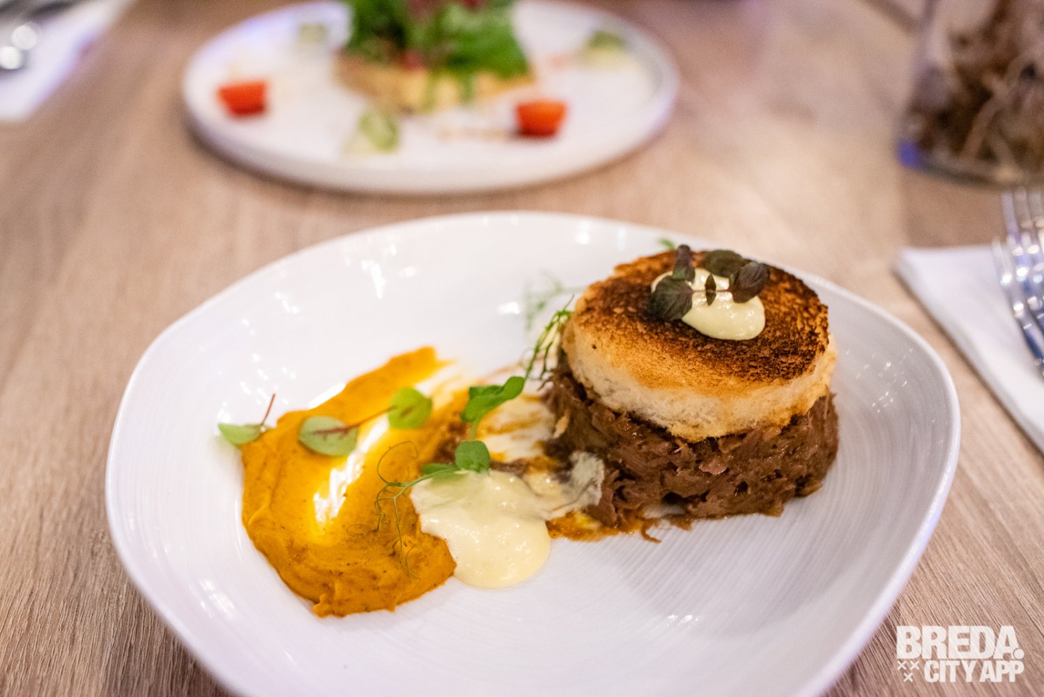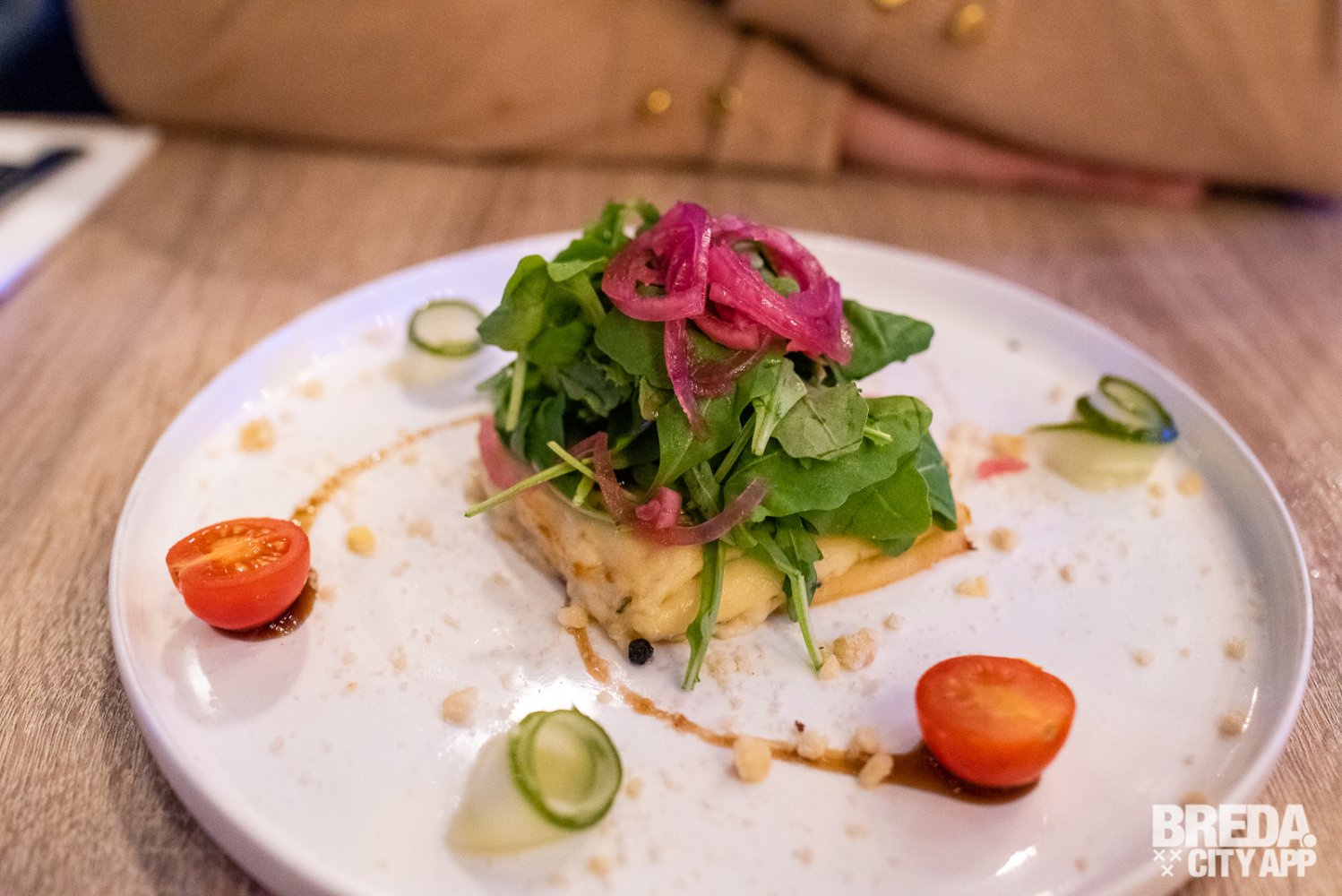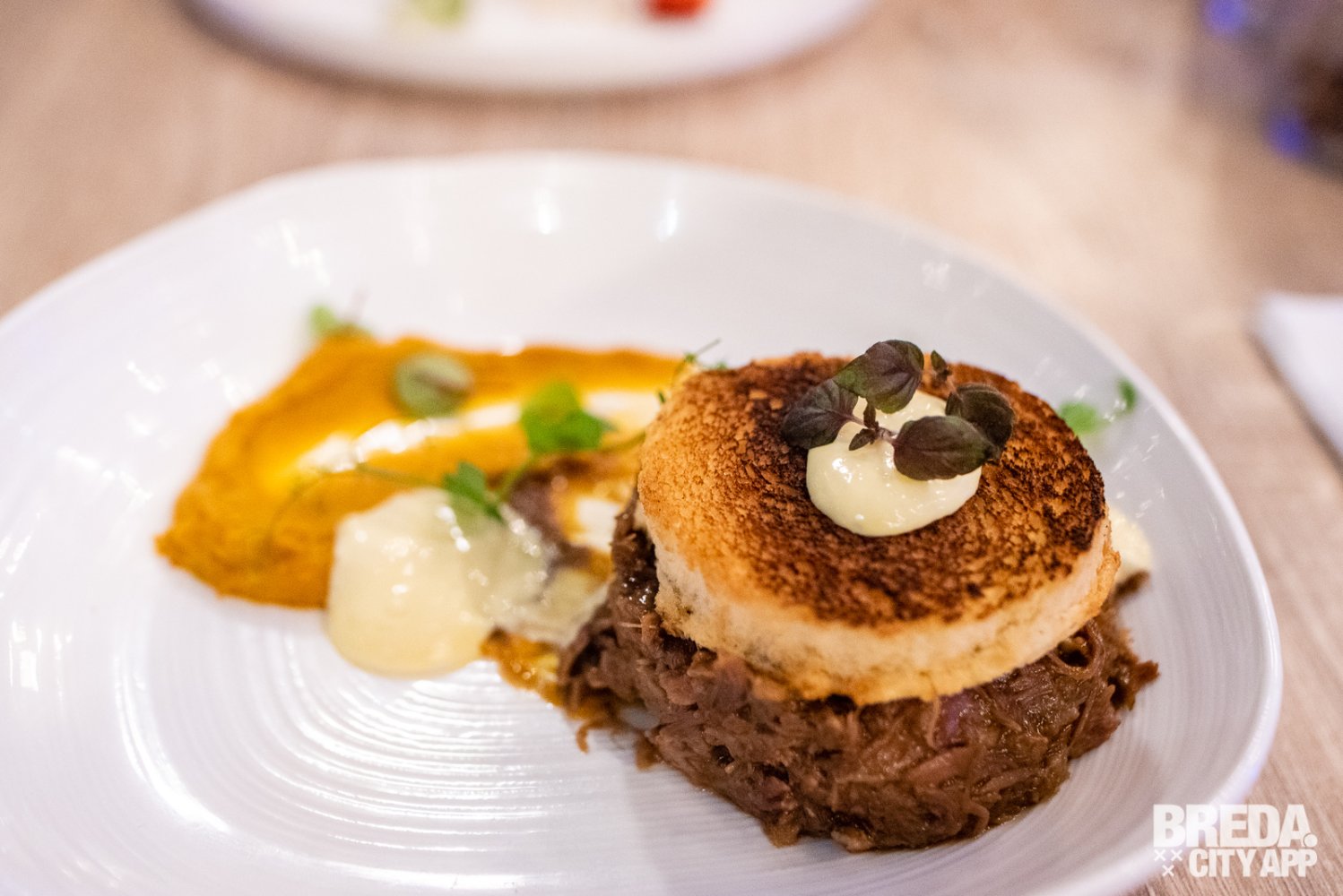 Dion serveert ons de voorgerechten. Voor ons staat de tompouce van brie en de runderwangen. De tompouce van brie bestaat uit brickdeeg belegd met een crème van brie, rode gekonfijte uien met balsamico, zoetzure rode ui en zoetzure komkommer. De smaak is heerlijk zacht, fris en uniek. Dit is geen standaard voorgerecht, maar een uniek voorgerecht.