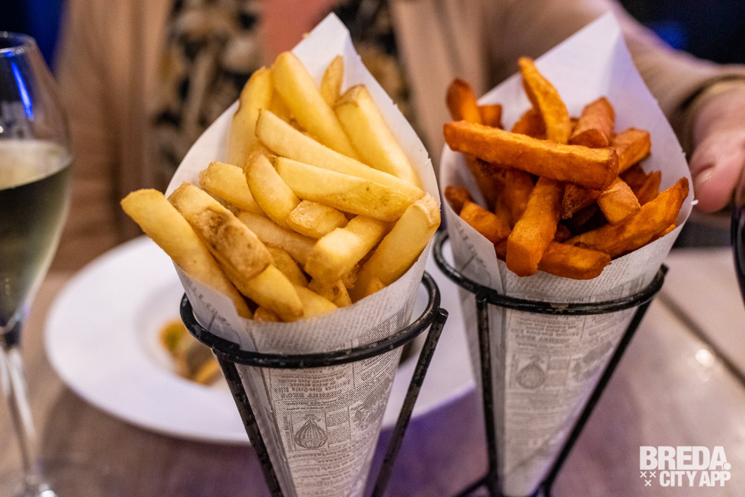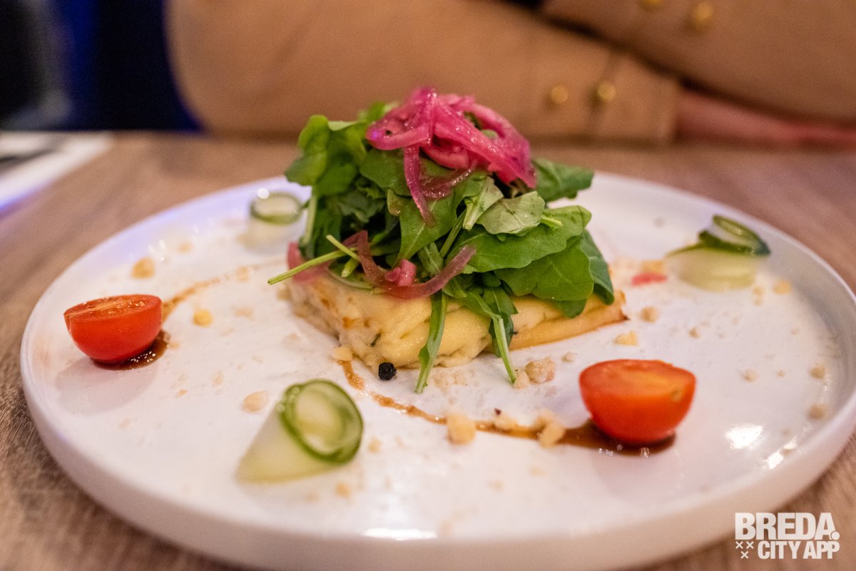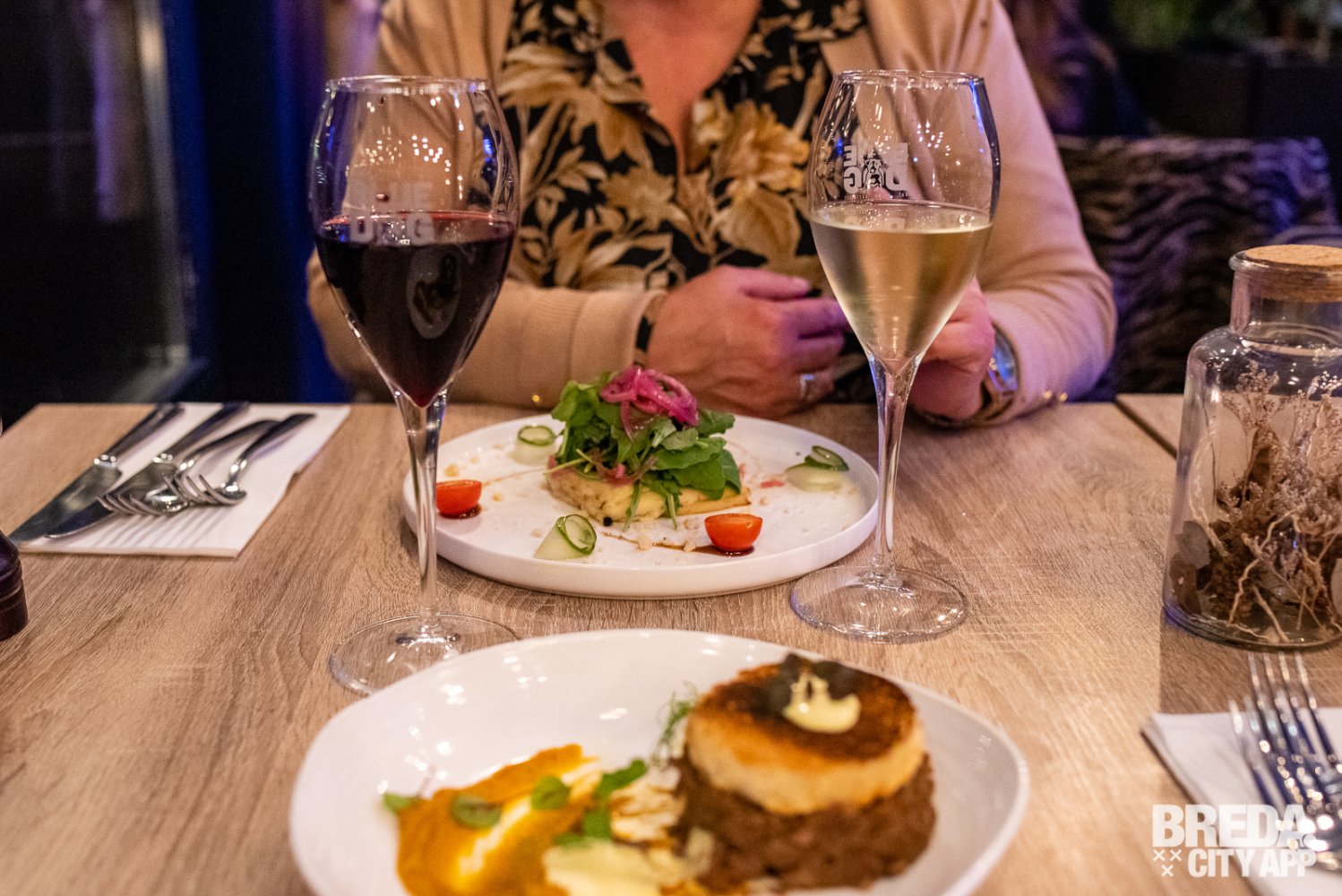 Dion serveert ons de voorgerechten. Voor ons staat de tompouce van brie en de runderwangen. De tompouce van brie bestaat uit brickdeeg belegd met een crème van brie, rode gekonfijte uien met balsamico, zoetzure rode ui en zoetzure komkommer. De smaak is heerlijk zacht, fris en uniek. Dit is geen standaard voorgerecht, maar een uniek voorgerecht.