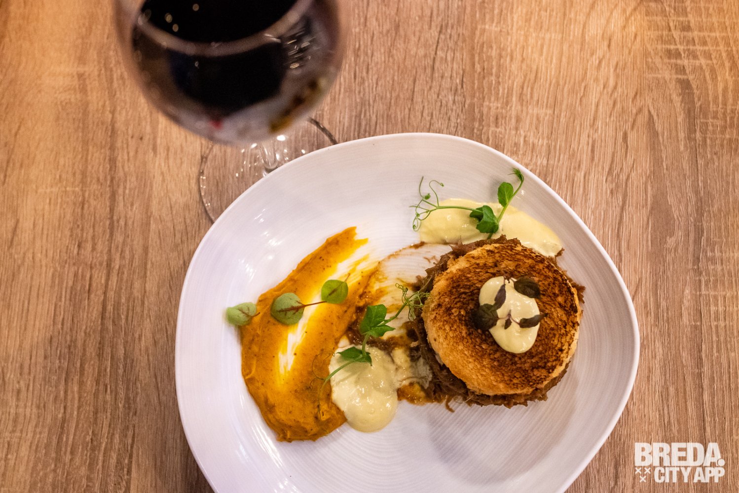 De pulled runderwangen worden twee uur lang in de oven gegaard en daarna geserveerd met vleesjus, brioche, hollandaise en een crème van pompoen. De wijn die er bij dit voorgerecht geserveerd wordt is een syrah. De syrah is een rode, krachtige wijn met veel tannines wat perfect past bij het rundvlees. De runderwangen zijn mals en de structuren van alle ingrediënten passen goed bij elkaar.