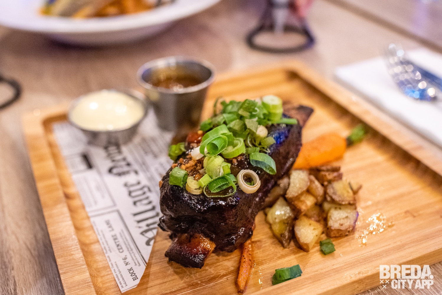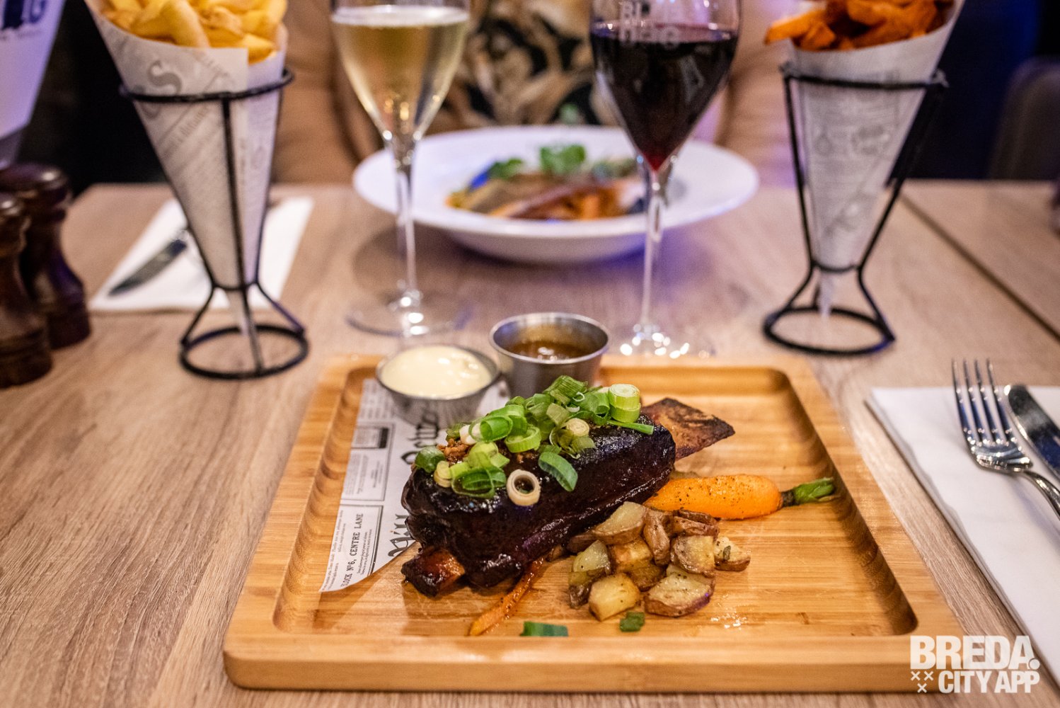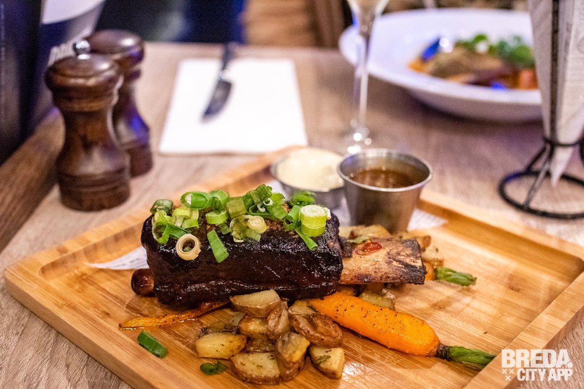 Als hoofdgerecht krijgen wij de shortrib en de zeebaars geserveerd. De shortrib wordt 24 uur lang in een dry rub gelegd en daarna nog eens 24 uur sous vide gegaard op 85 graden. De shortrib wordt geserveerd met gefrituurde knoflook, parmezaan, bospeen en een knoflookjus. De merlot die erbij wordt geserveerd is een zachte rode wijn met veel smaak en karakter.