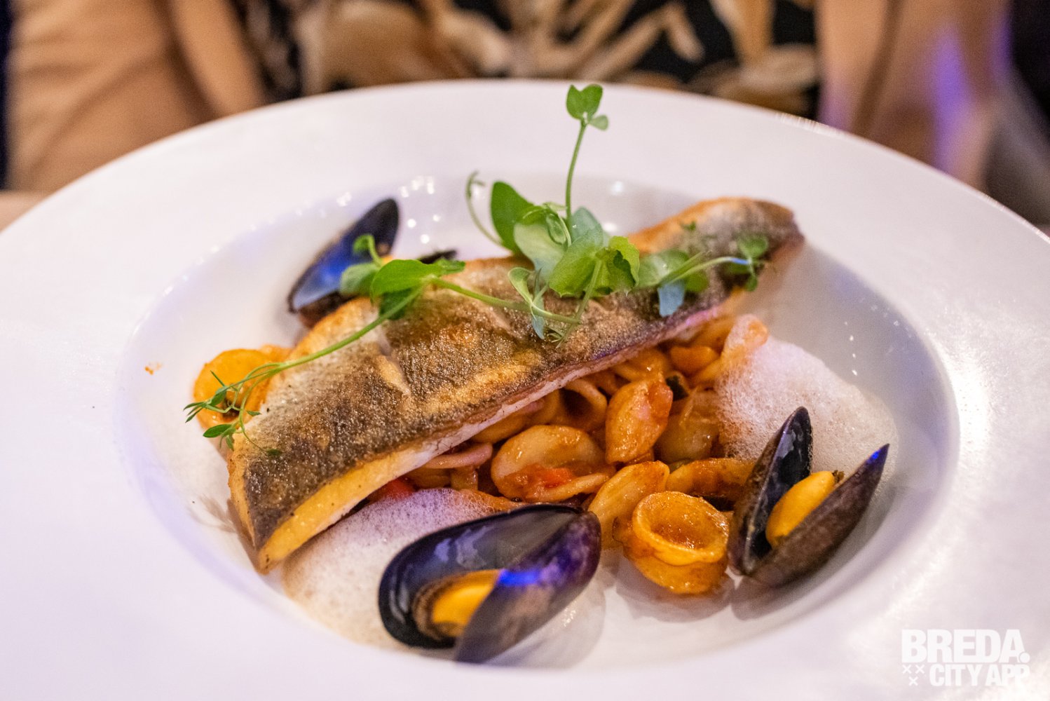 De pasta past goed bij de vis en de mosselen zijn een goede aanvulling. De wijn die bij dit gerecht geserveerd wordt is een chardonnay die erg vol van smaak is en daarom goed past bij de zeebaars.