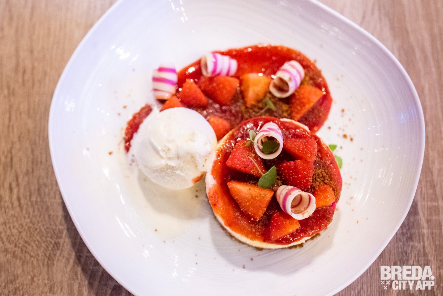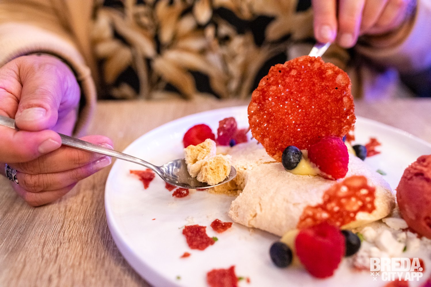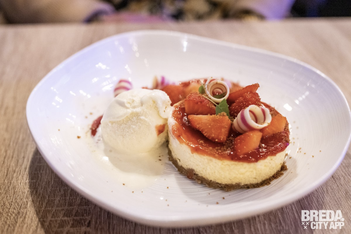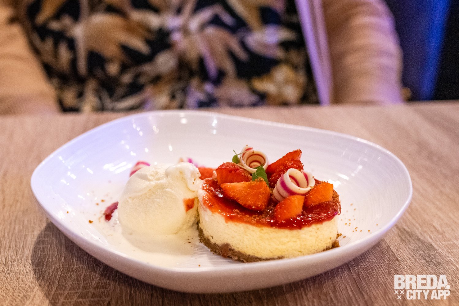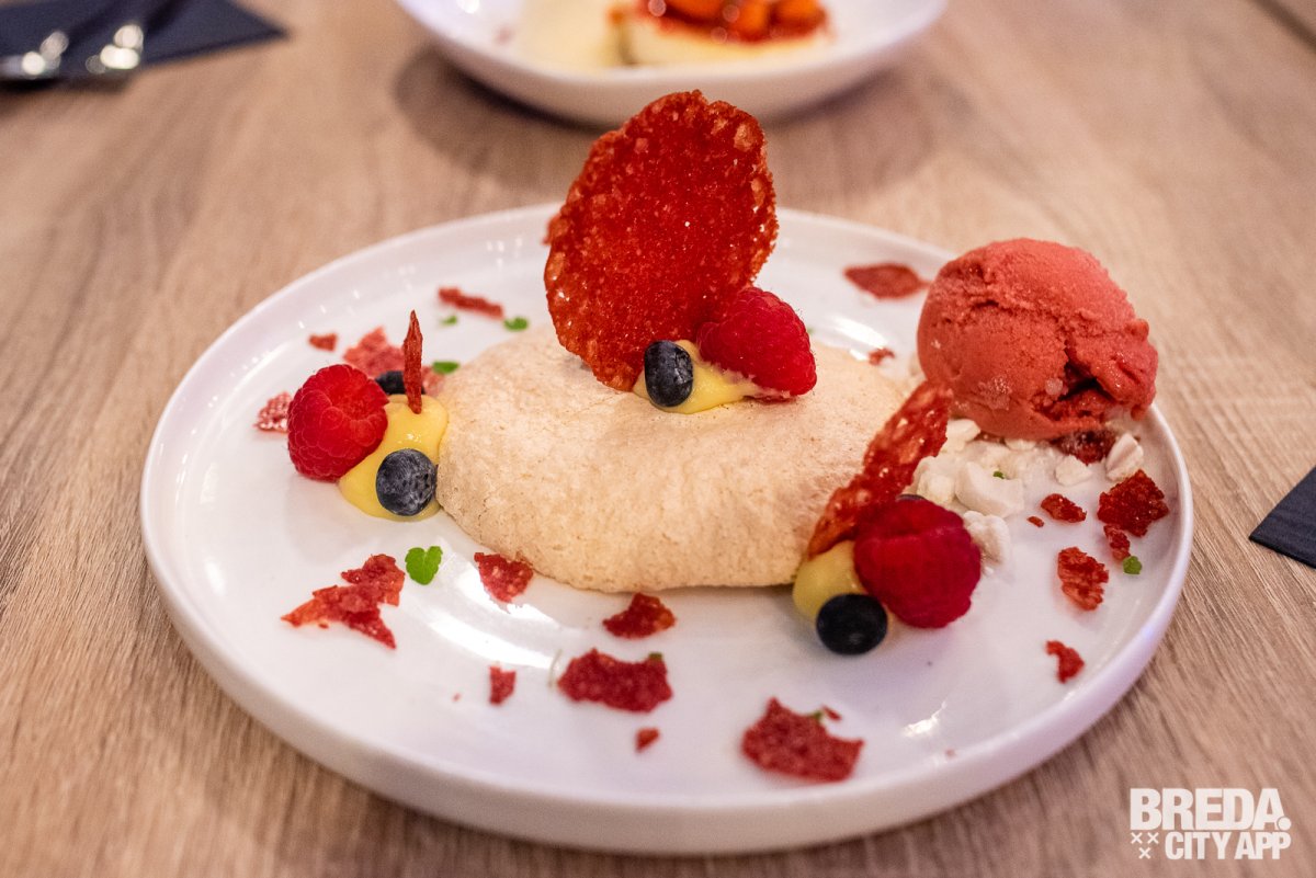 Als de gastheer komt aanlopen met de desserts weten we niet wat we zien; wat ziet dit er goed uit! Dion vertelt ons dat wij voor ons een witte chocolade cheesecake en een pavlova hebben staan. De witte chocolade cheesecake heeft een bodem van Bastogne en een topping van aardbeien gel. Deze gel doet denken aan de jam van oma, omdat er ook vers rood fruit bij geserveerd wordt. De cheesecake is een stevige cake wat erg lekker is. Het is zoet, fris en vooral erg lekker.