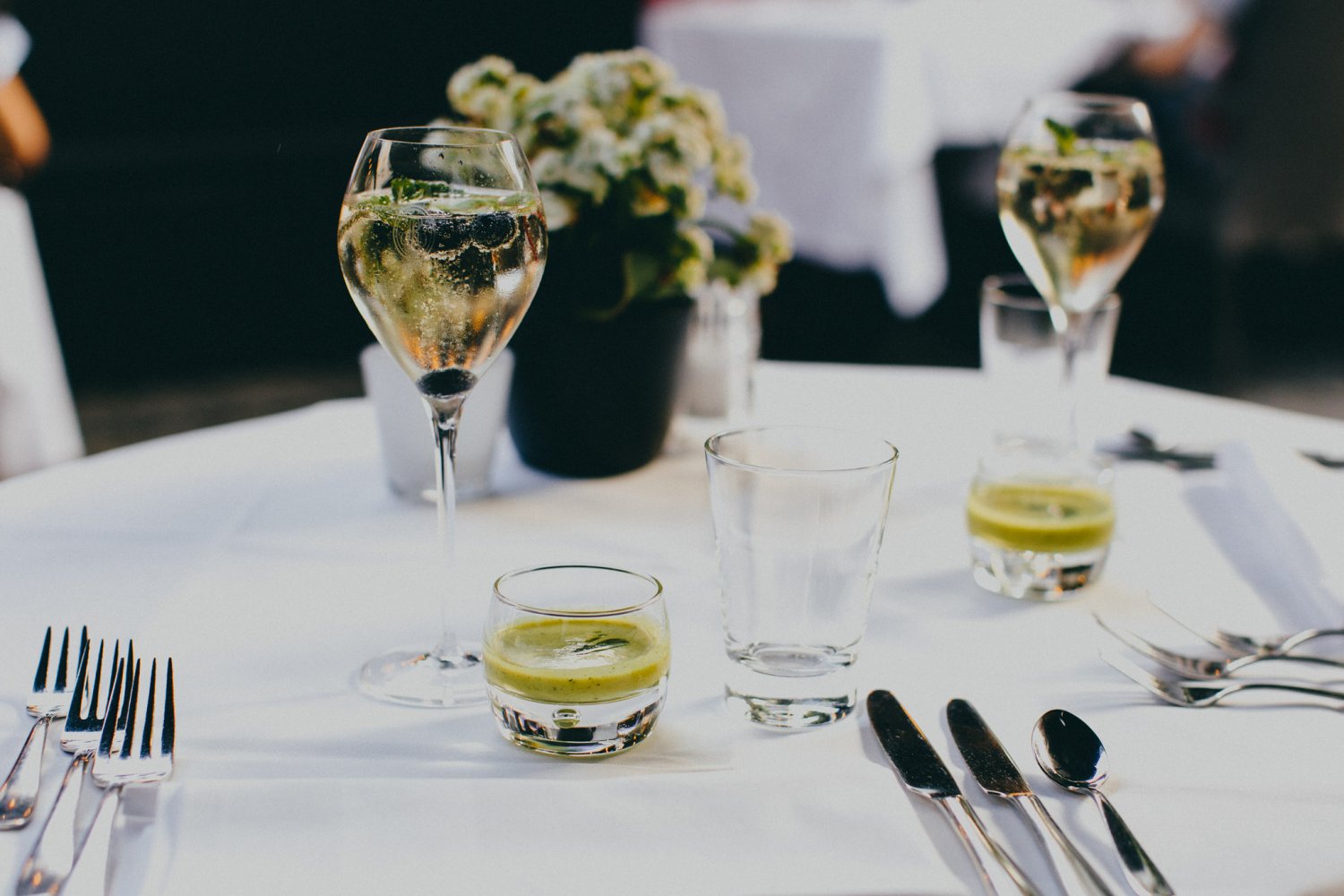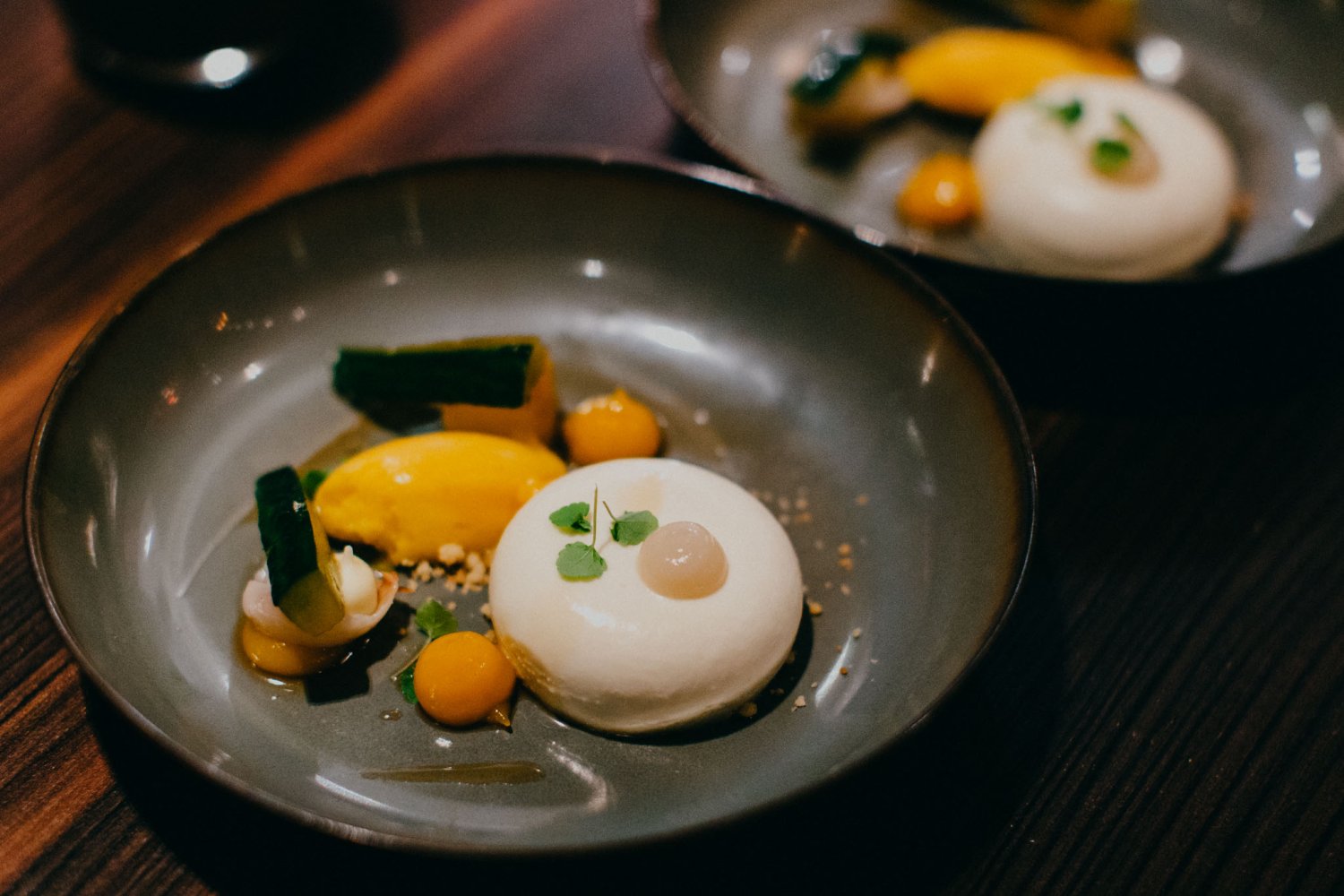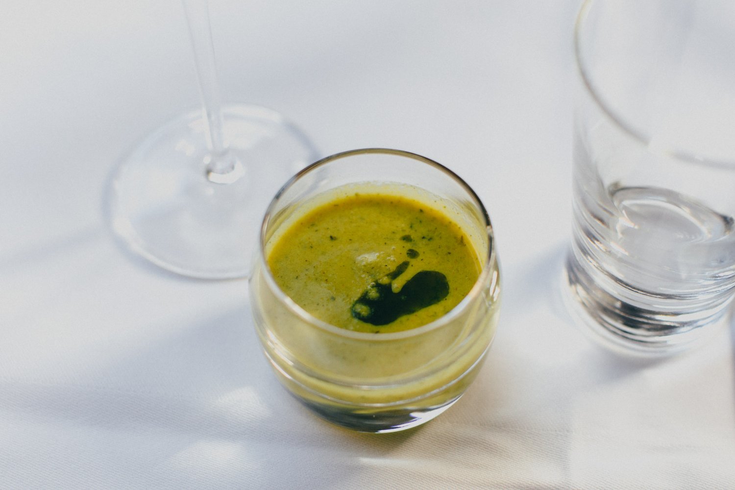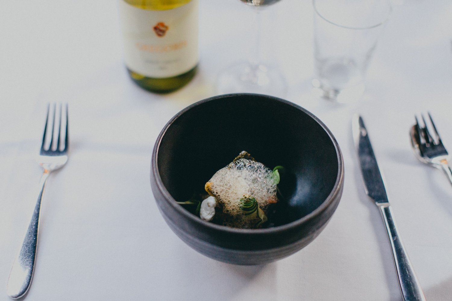 Net zoals vele jonge meisjes op hun eerste date, word ook ik graag op mijn gemak gesteld met alcohol. Dit kwam in de vorm van een verrassend frisse elderflower cocktail met blauwe bessen en munt. Dit samen met een amuse bestaande uit een koud courgette soepje met kokos en gele curry zette al direct de toon van wat er komen ging en het werd er niet bepaald slechter op. Voorafgaand van het eerste gerecht werden de magische woorden uitgesproken in de vorm van de vraag of wij gebruik wilden maken van het wijnarrangement. De serveerster zat blijkbaar zo geweldig op dezelfde lijn met ons, dat ik soms af heb moeten vragen of ik wel verkering had met juiste vrouw.