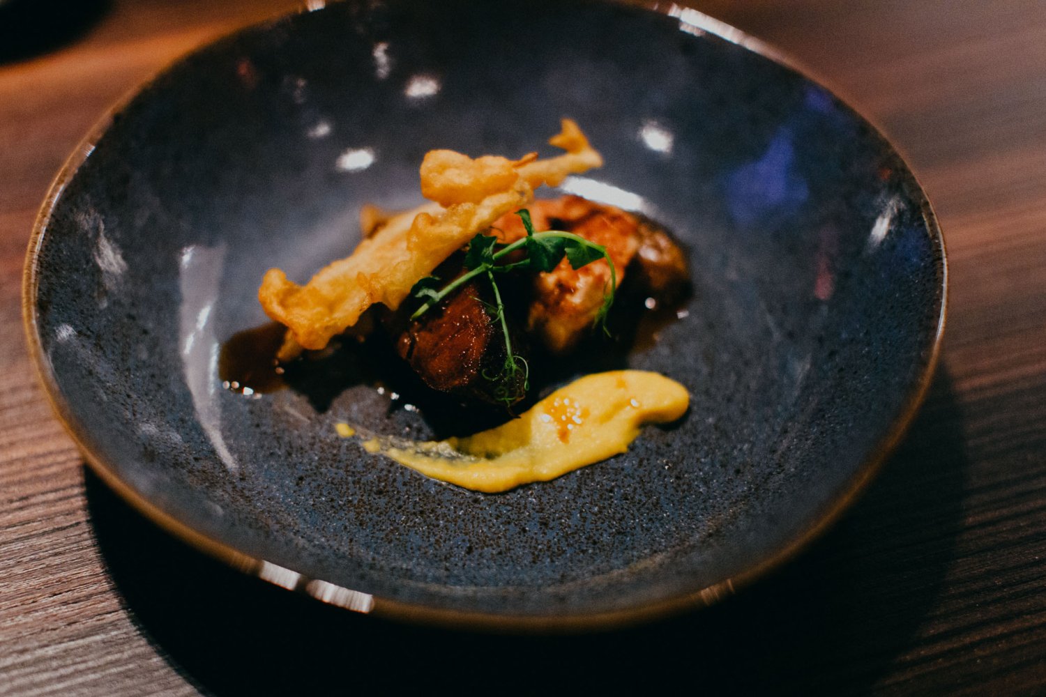 Het eerst opvolgende gerecht was een Babi Ketjap met verrassende ingrediënten; een malse zwezerik met een subtiel zoetje wat je niet snel zou verwachten, bijgestaan door gefrituurde taugé met een zachte crème van mais.