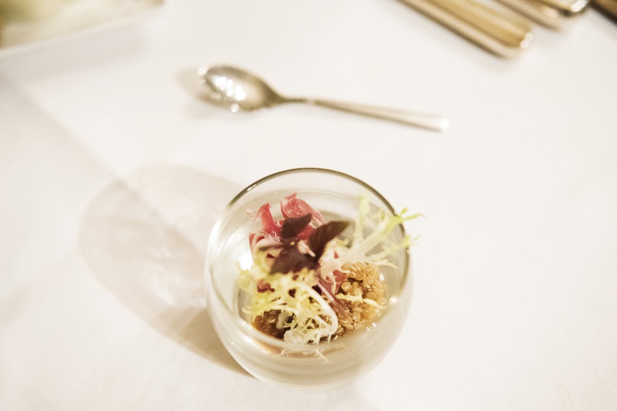De amuse die volgde was een interessante combinatie van texturen en smaken. We kregen een panna cotta van Vadouvan (een Franse interpretatie van Indiase kerrie), geitenkaas van de Bokkensprong, quinoa, een vinaigrette van gefermenteerde zwarte bonen en een krokantje van gepofte rijst. Hierbij werd vers boerenbrood met boter en reuzel geserveerd. De reuzel had een mooie barbecue rooksmaak en maakte voor mij het gerechtje helemaal af.