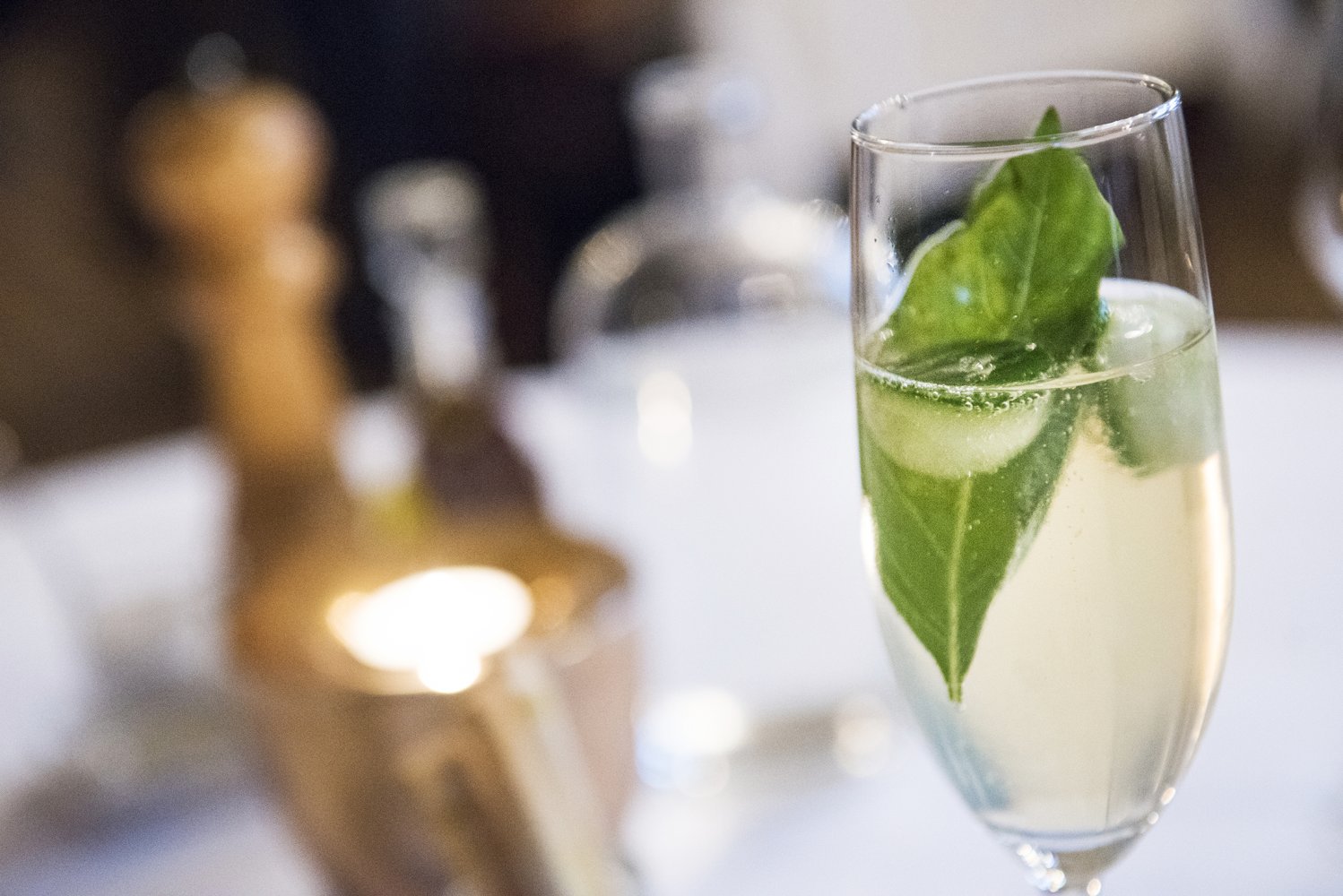 Na de vriendelijke ontvangst door Sommelier Marcel nemen we plaats in de 'huiskamer', waar we direct een aperitief aangeboden krijgen. Cava met limoncello, basilicum en een bolletje komkommer.