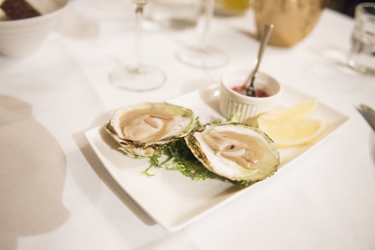 De platte oesters 00000 staan op de kaart aangeduid met een aantal nullen. Deze cijfers staan voor de leeftijd van de oesters. Sommelier Marcel verteld ons hoe we dit op de schelp ook zelf kunnen zien en het verschil in smaak en textuur tussen een reguliere oester en deze platte variant. Onze reactie maakte hem aan het lachen aangezien we verbaasd reageerden met 'veel minder glibberig en een stuk vleziger'. Voor liefhebbers van oesters is dit echt een traktatie.