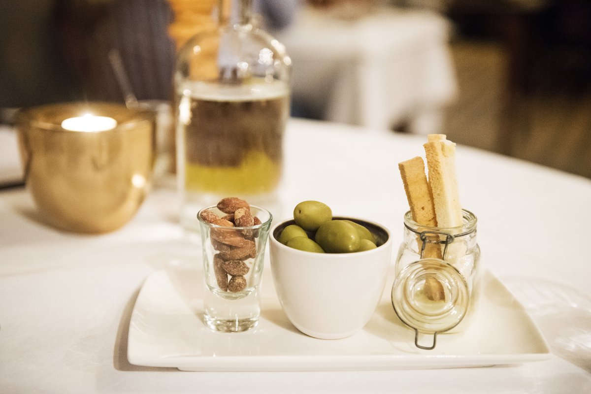 Het drankje werd geserveerd met gerookte en gezouten amandelen, grote vlezige olijven uit de hak van Italië en broodsoldaatjes in een mierikswortel dip. Een lekker aperitief, waarmee onze smaakpapillen goed losgemaakt werden.