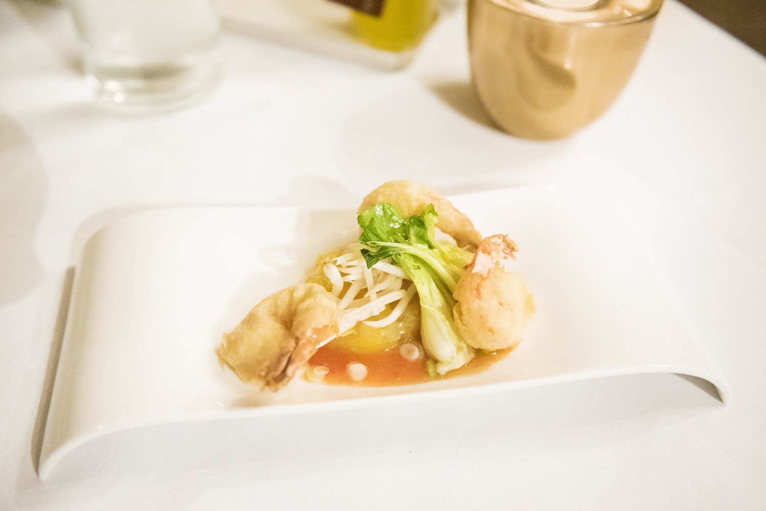 Mijn tafelgenoot kreeg de gamba's in tempura met mini paksoi en huisgemaakte chili-saus. Daarbij werd een zoete compote van mango met rode peper geserveerd. Het gerechtje had een mooie balans van zoet, zuur en scherp. De wijn die erbij werd geserveerd was een Chasselas Vielles Vignes van Schoffit uit Alsace.