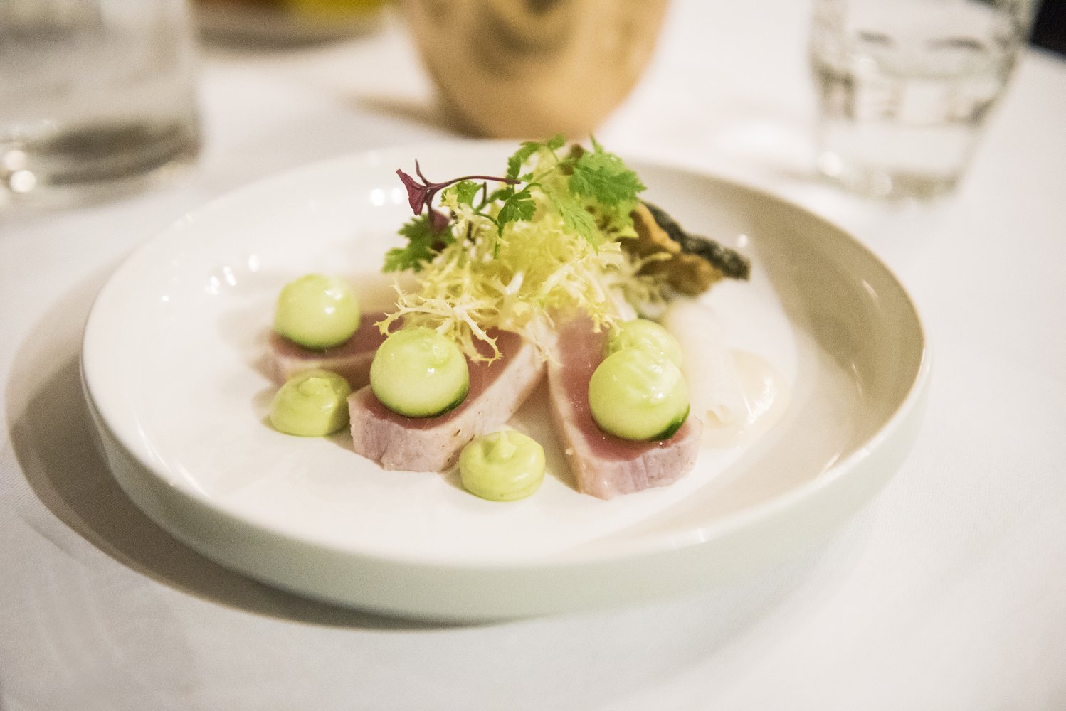 Mijn gerecht was een tataki van Albacore tonijn met bolletjes zoetzure komkommer en frisse rettich. De tonijn was licht geschroeid en werd geserveerd met een zachte crème van miso, krokante nori en ponzu. Een mooi stukje tonijn heeft eigenlijk bijna geen toevoegingen nodig, maar met de combinatie van zoet en zuur was het gerecht mooi in balans. Bij het gerecht werd een Domaine de Pontract uit Côtes de Provence geschonken.