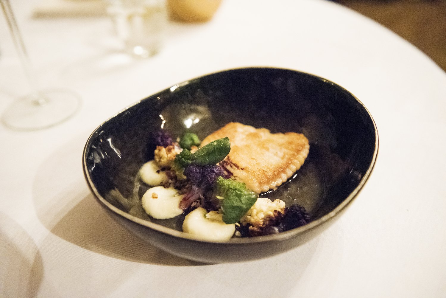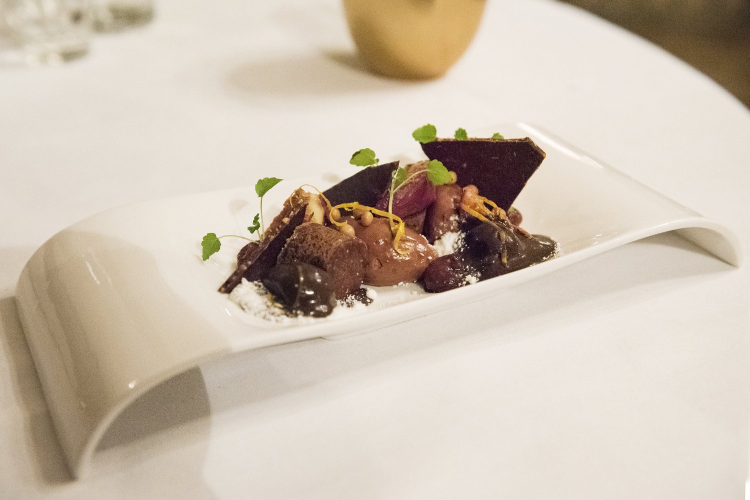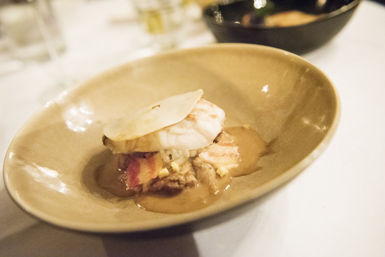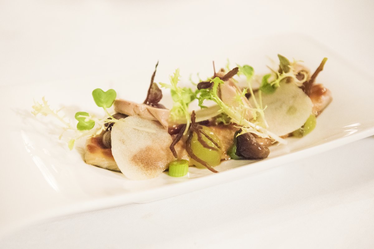 Mijn derde gang was een op de huid gebakken kabeljauw met knolselderij mousseline en krokante pancetta, die zorgde voor extra textuur. Daarbij werd een huisgemaakte uien soubise en een zacht romige saus van eekhoorntjesbrood geserveerd. Hierbij werd een witte Rioja afkomstig uit Spanje geschonken; de Nivarius met een blend van Tempranillo Blanco en Viura druif.