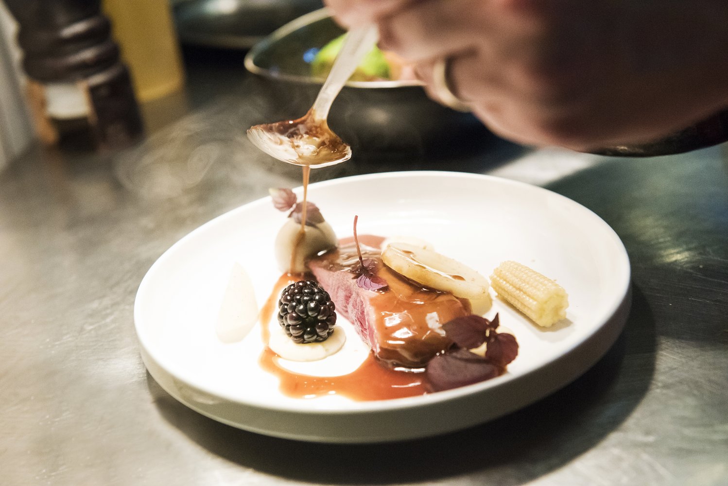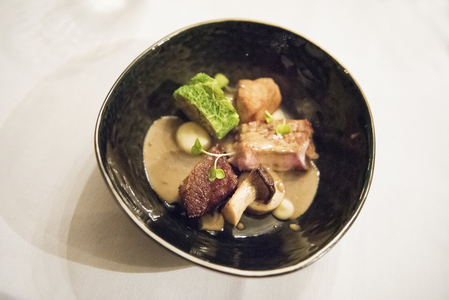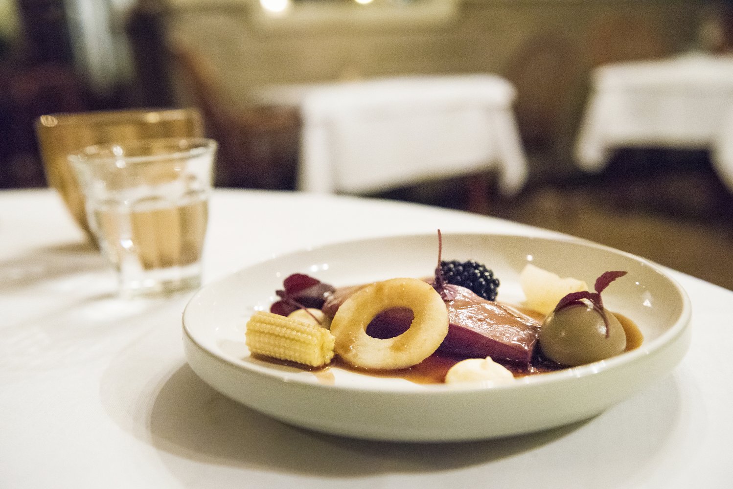 Ik ging voor de gebraden eendenborst (van een wilde eend) met een bombe van ongemeste lever, een zachtzoete braam en een gerookte biet met een schijfje meiknol in eigen jus. Het gerecht is niet alleen een lust voor het oog, maar ook heerlijk op smaak. De malse eendenborst wordt mooi gecomplementeerd door de verschillende ingrediënten.